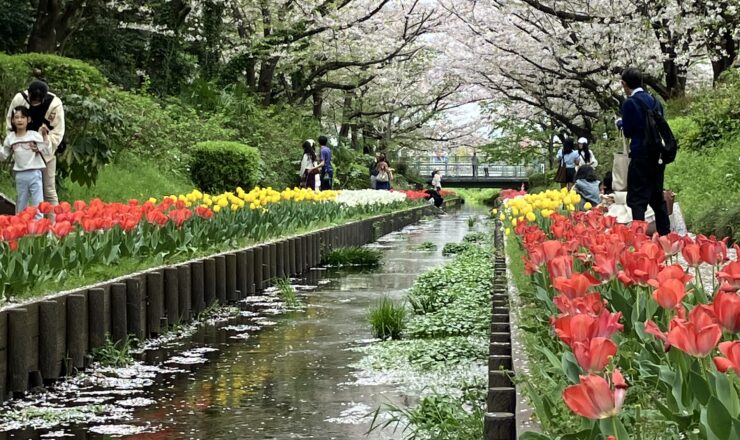 満開の桜とチューリップが咲いている江川せせらぎ緑道へ、行きました。 桜の花びらが散り始めました。 色々な種類のチューリップが咲...
