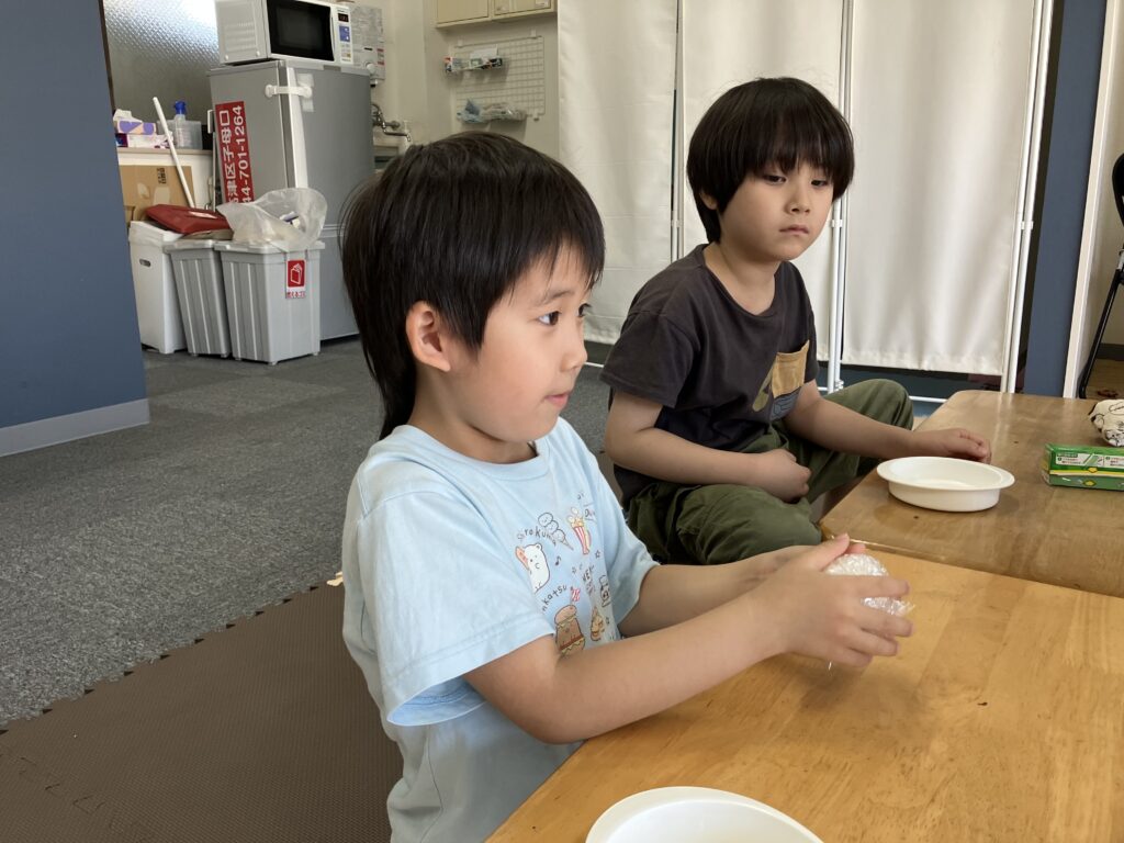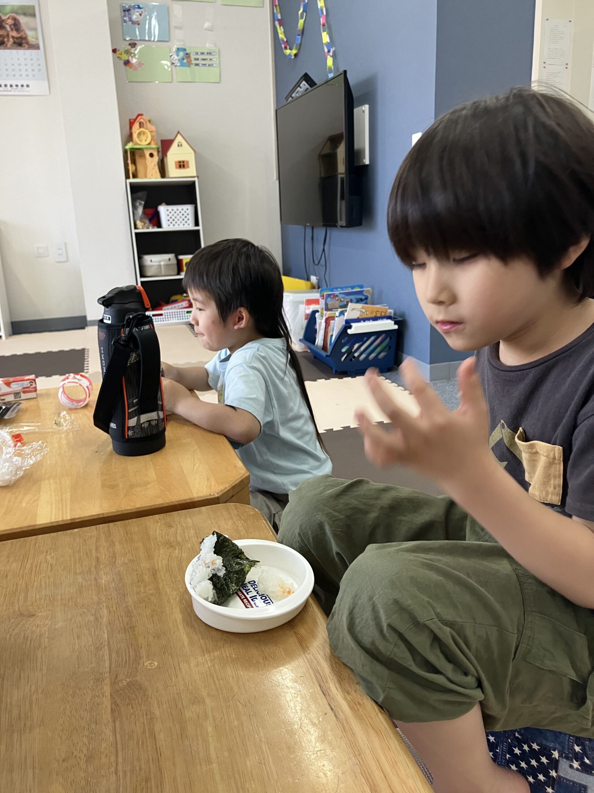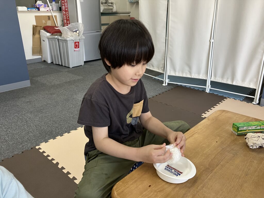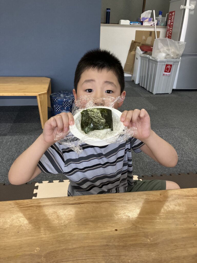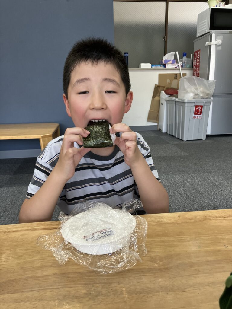 おにぎり作り 1 5月24日 おやつにおにぎりを食べるため、おにぎりを作りました。 ご飯が熱いよ。具は、鮭です。 にぎる前に食べようとしています。 海苔を巻いて、頂きます。 おにぎりの出来上がり お味は、いかがですか。 5月22日の様子 5月27日の様子