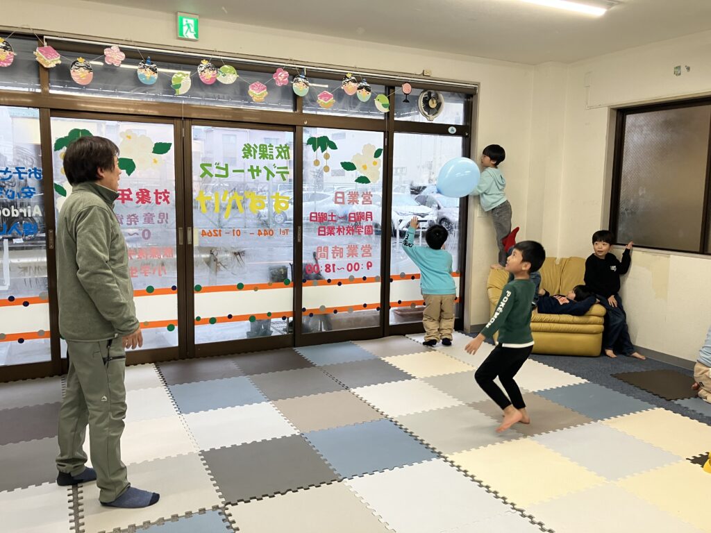 甘いおやつを食べたので、身体を動かしました。風船を落とさないでね。