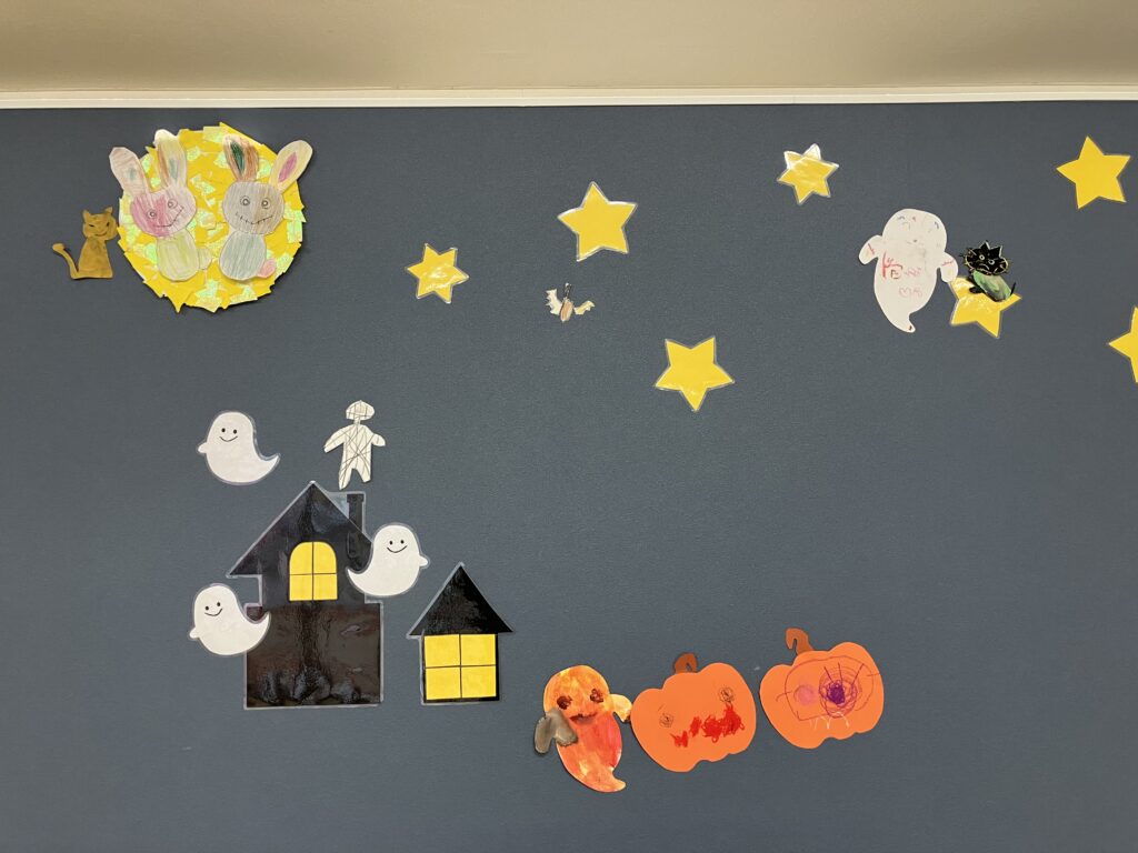 ハロウィンに向けて、壁の飾り作りをしています。今年も、地域の方々の協力を得て、仮装して出掛けます。