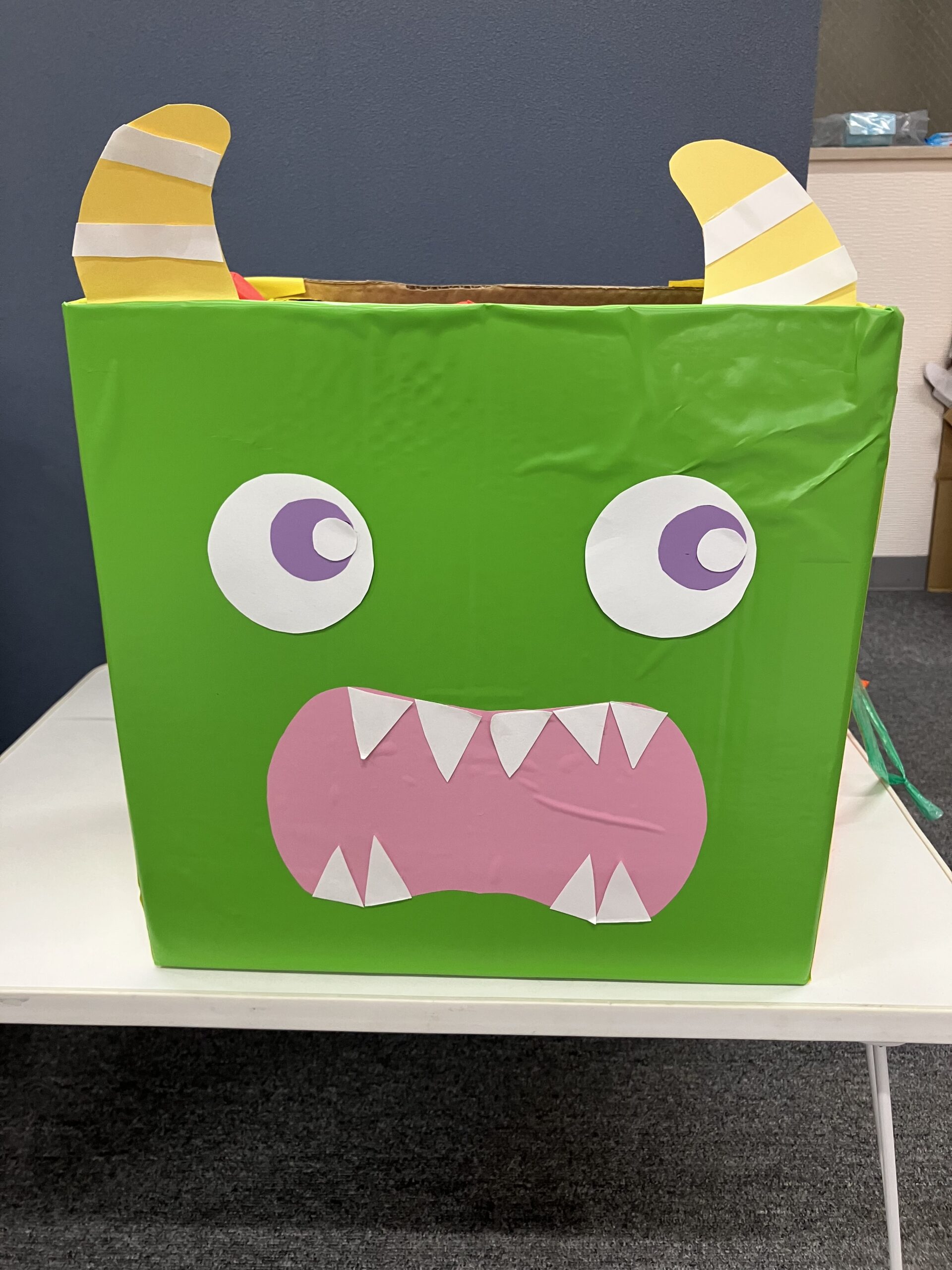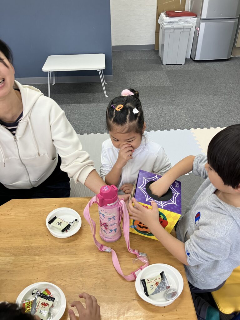 箱からお菓子をとります。ハロウィンお菓子は、なんですか。
