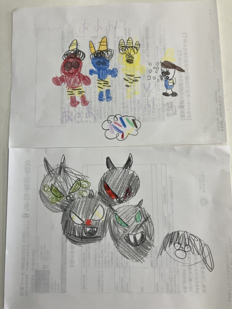 “今日、何をしたかと”聞きましたら、豆まきの絵を描いてくれました。(笑)