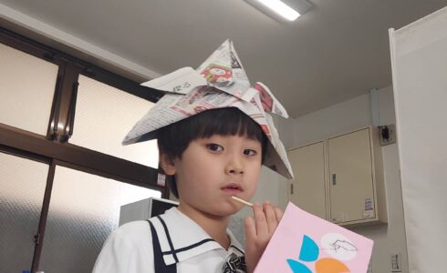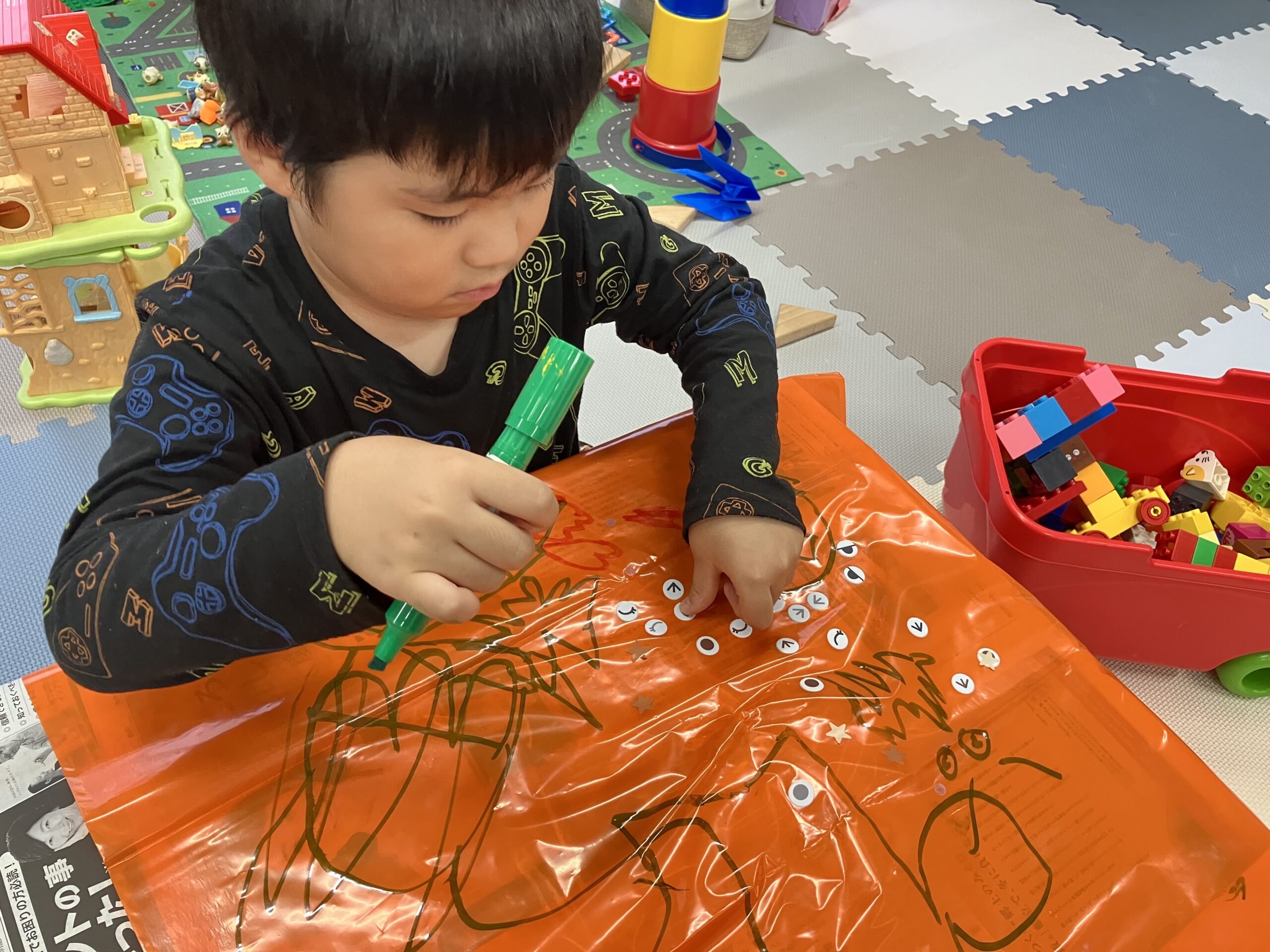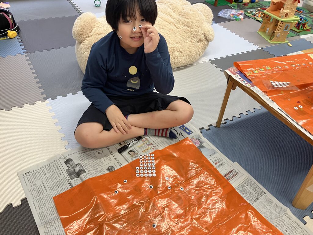 シールを顔につけています。