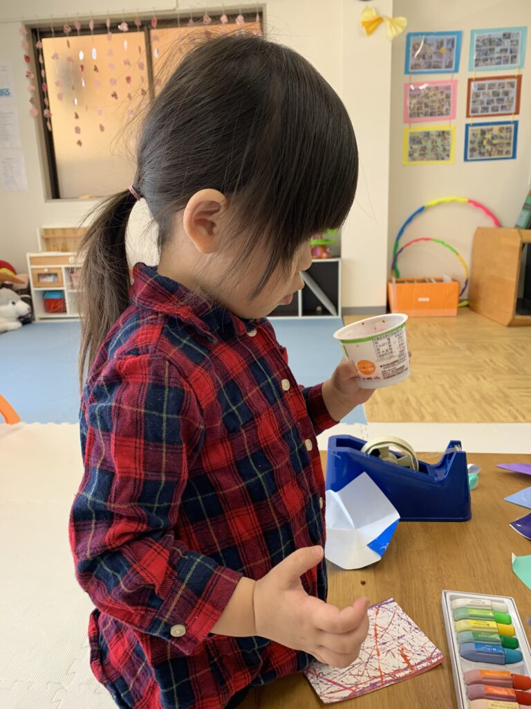 ビー玉に色をつけるため、赤・青・黄色と言いながら、容器の中でビー玉を転がしています。
