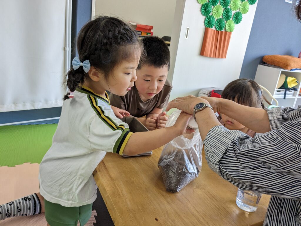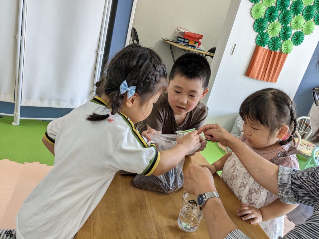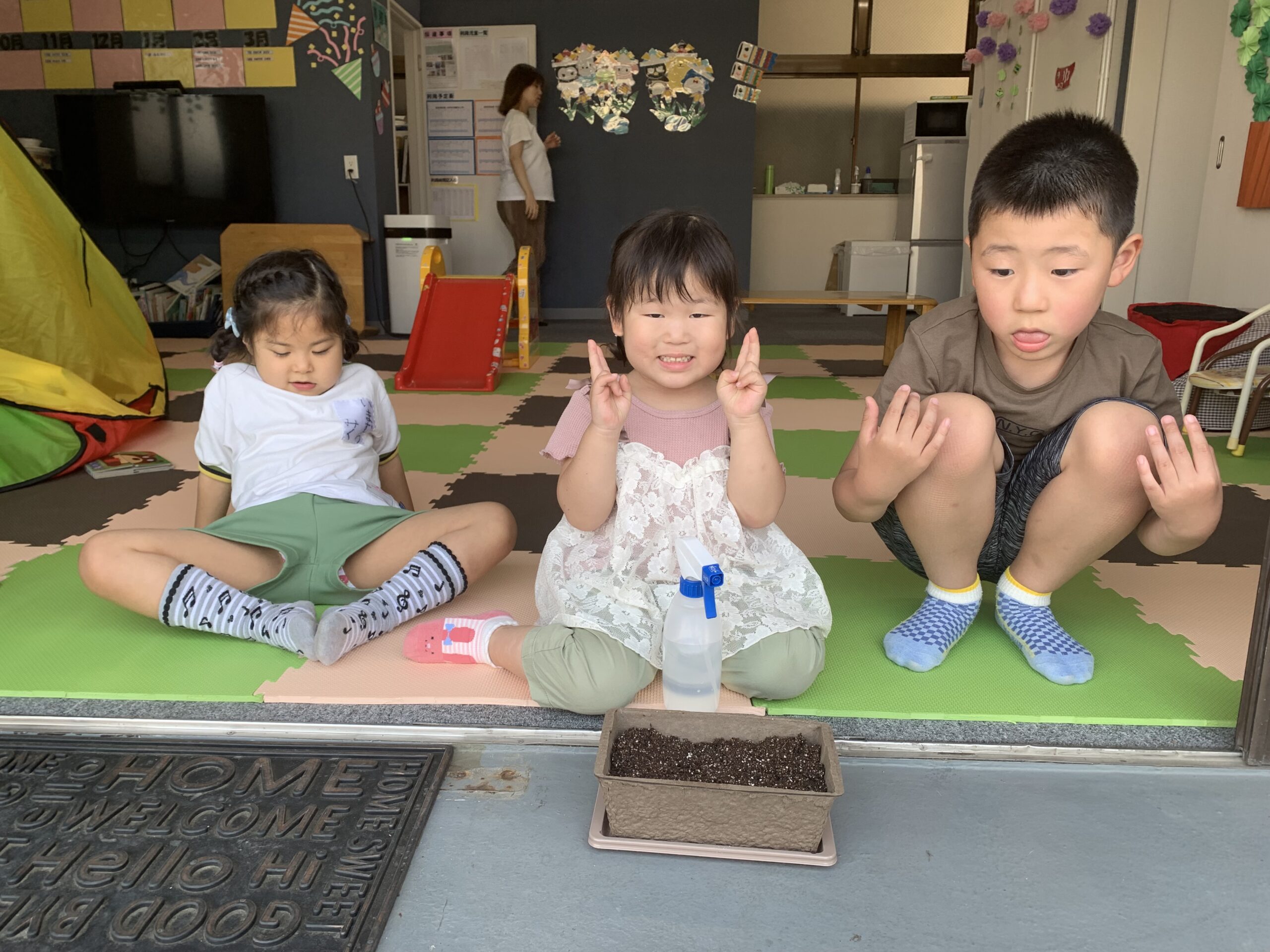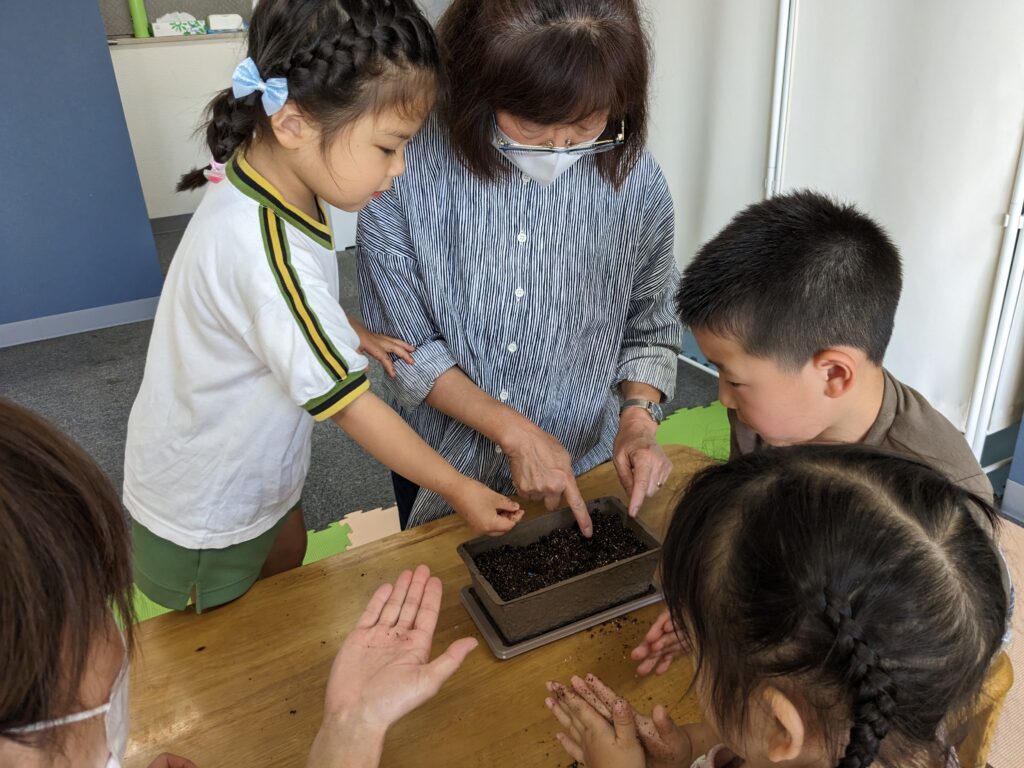 ミニひまわり栽培3 5月22日 お兄さんと一緒にひまわり栽培をしました。 水が入れやすいようにビニール袋を広げてくれています。ありがとう。 タネを植えます。 みんなで水やりです。 鷺沼公園へ(宮前区鷺沼2丁目)午前5月22日 おもちゃを頂きました。5月23日