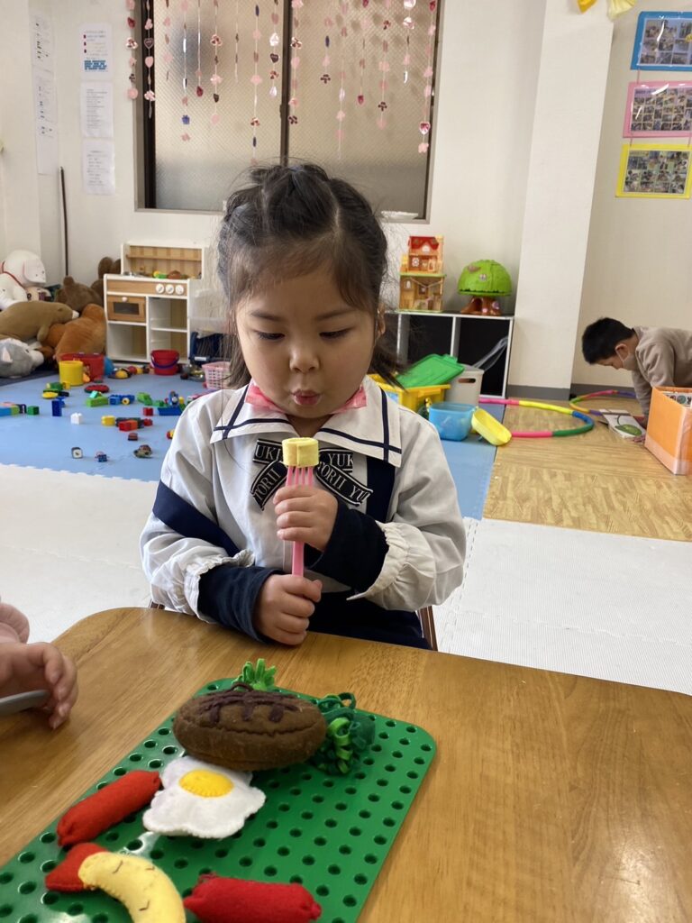 レストランへようこそ 2月27日 レストランを本日、オープンしました。 私がオーナーです。よろしくお願いします。 ハンバーグを切って、焼けているか確認しています。 楽しかったね。2月27日 ボール取りゲーム 2月28日