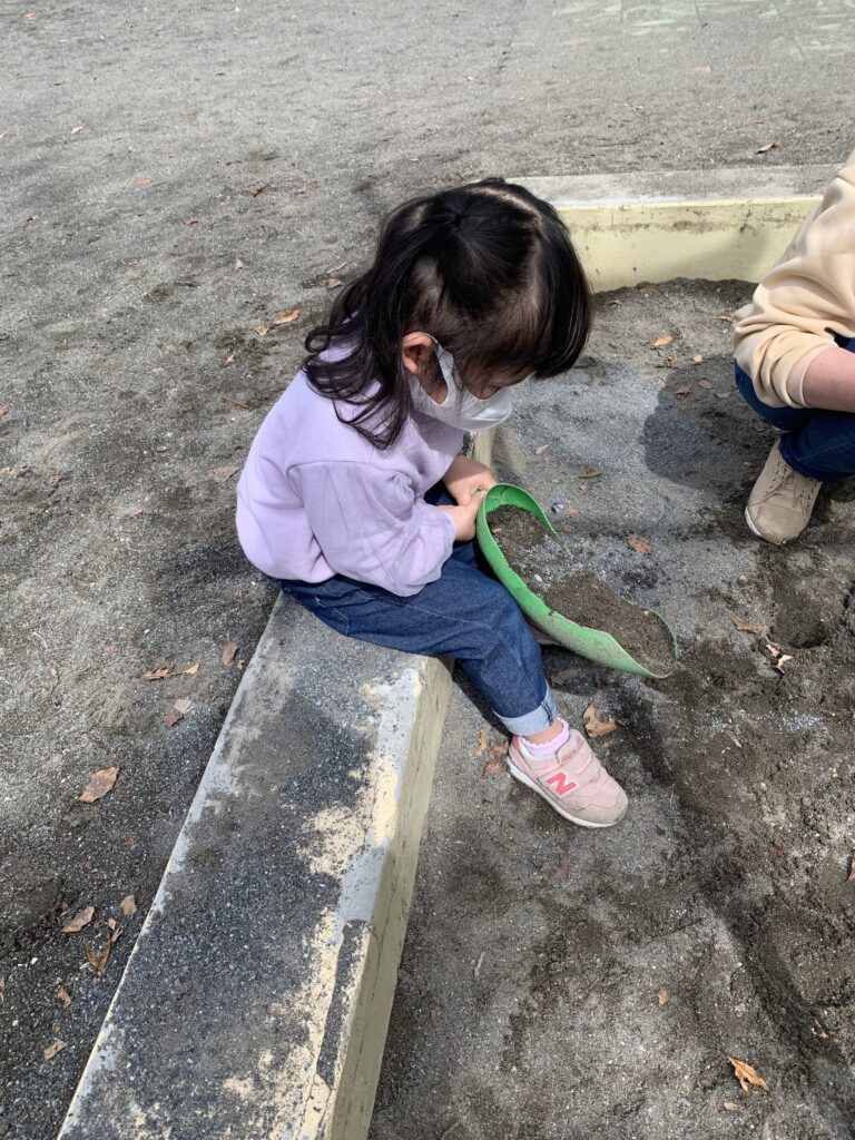 今日は、遊具より砂場で遊び始めました。砂を掘りおこしています。