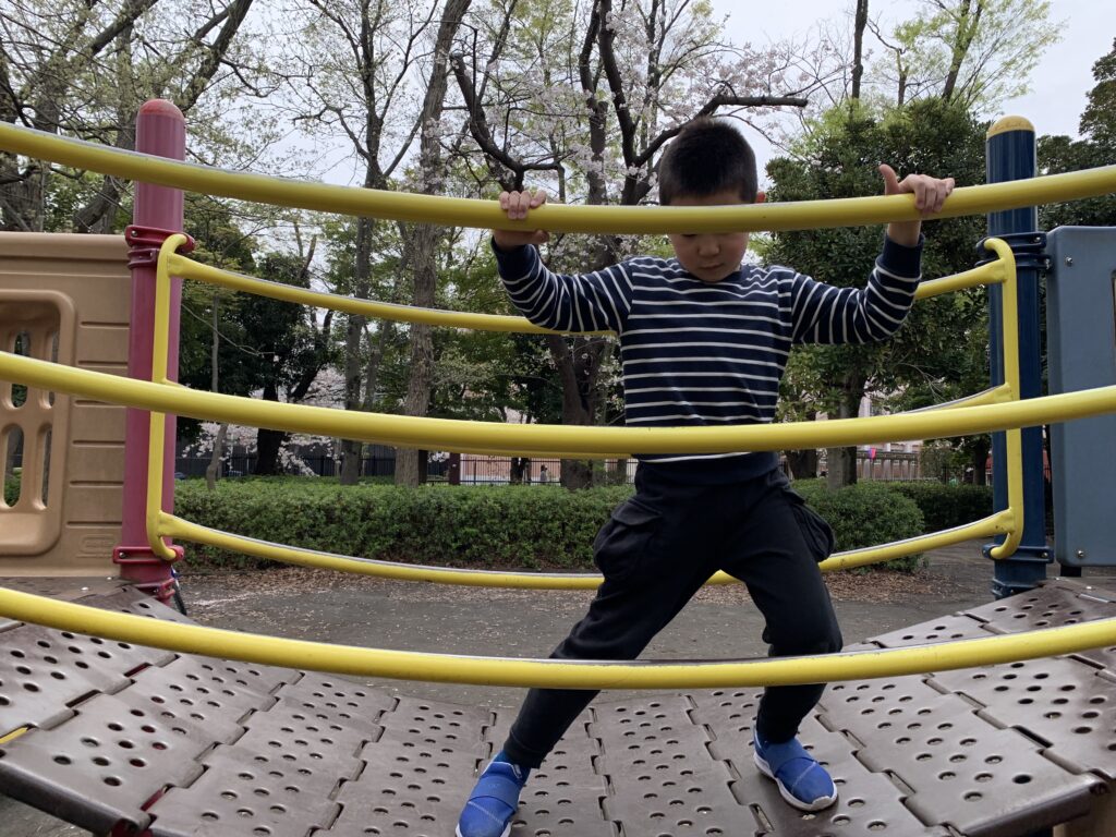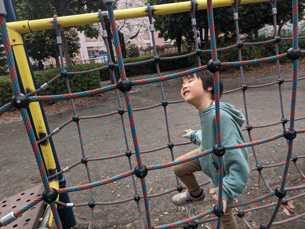 中原平和公園へ(木月住吉町) 3月27日 午後、昼食を早めに摂って遊びに行きました。 余裕の滑り 慎重派 綱を跨いでいるだけ 揺らし過ぎて、少し怖い 重くなったね。 登るのは、ここまで 桜と一緒に 室内の様子 3月24日 3月28日の様子