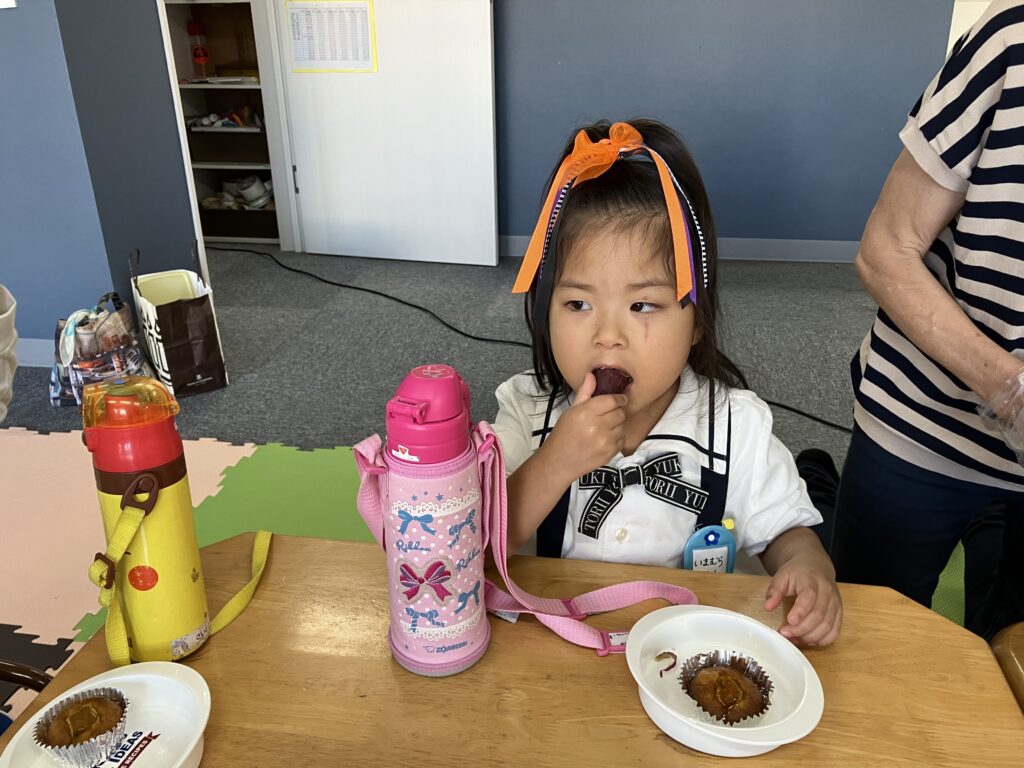 今日のおやつは手作り 10月23日 楽しみにしていたさつま芋とカボチャマフィンを食べました。美味しいですか。 さつま芋の味は、いかがですか。 カボチャマフィンに挑戦しました。挑戦するという事が大事だからね。 さつま芋にがぶり。 10月19日の様子 ハロウィン衣装作り 10月23日