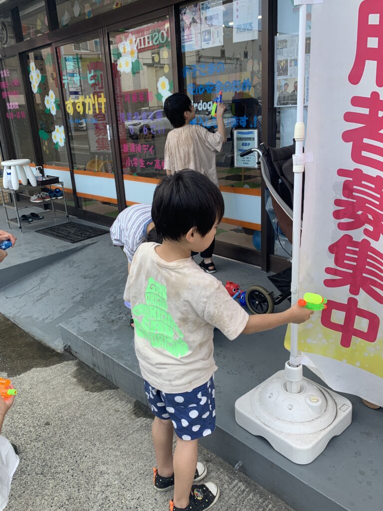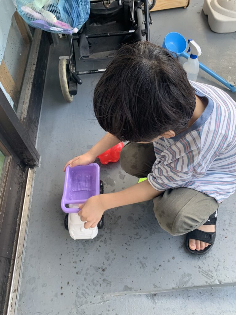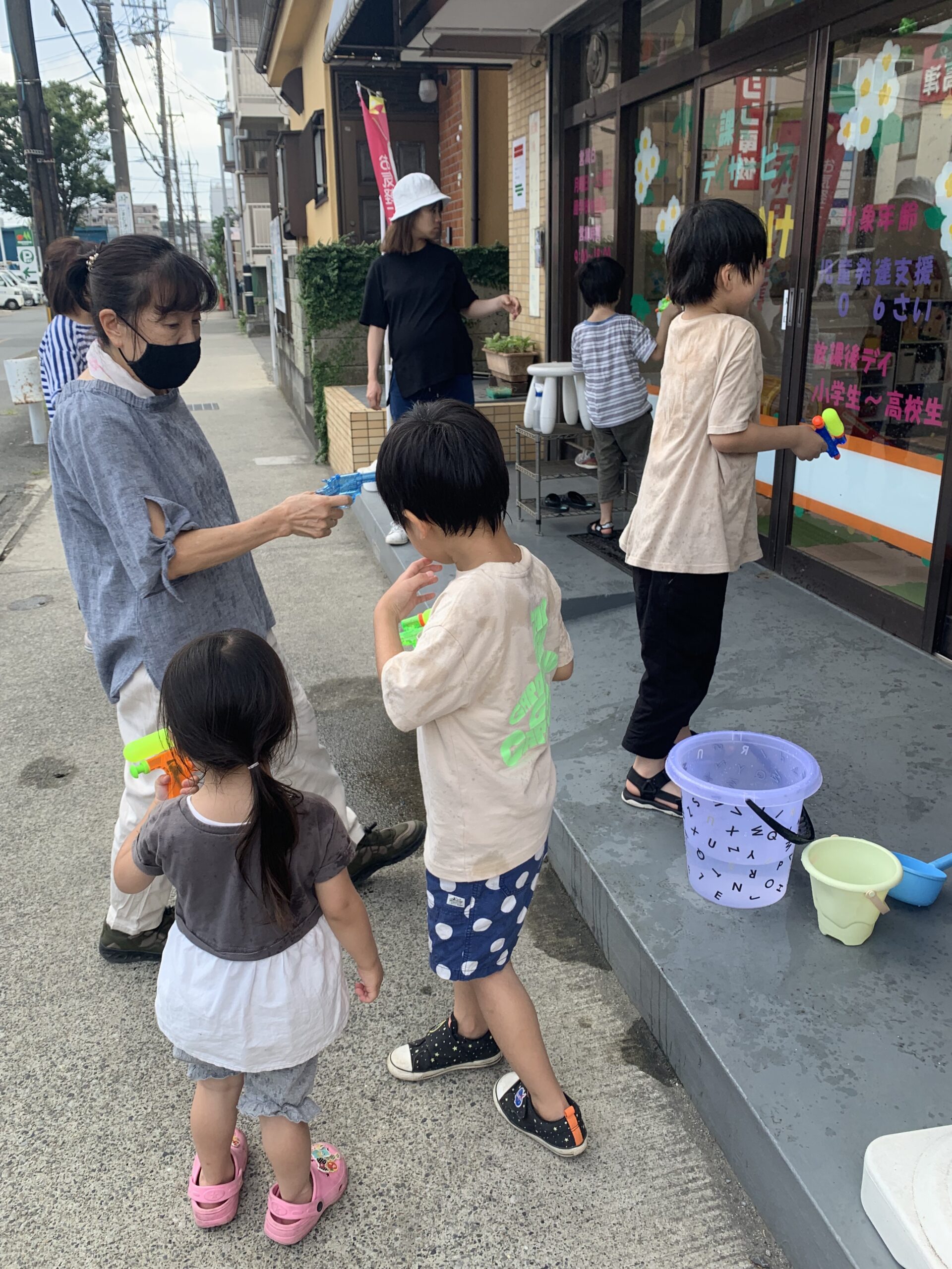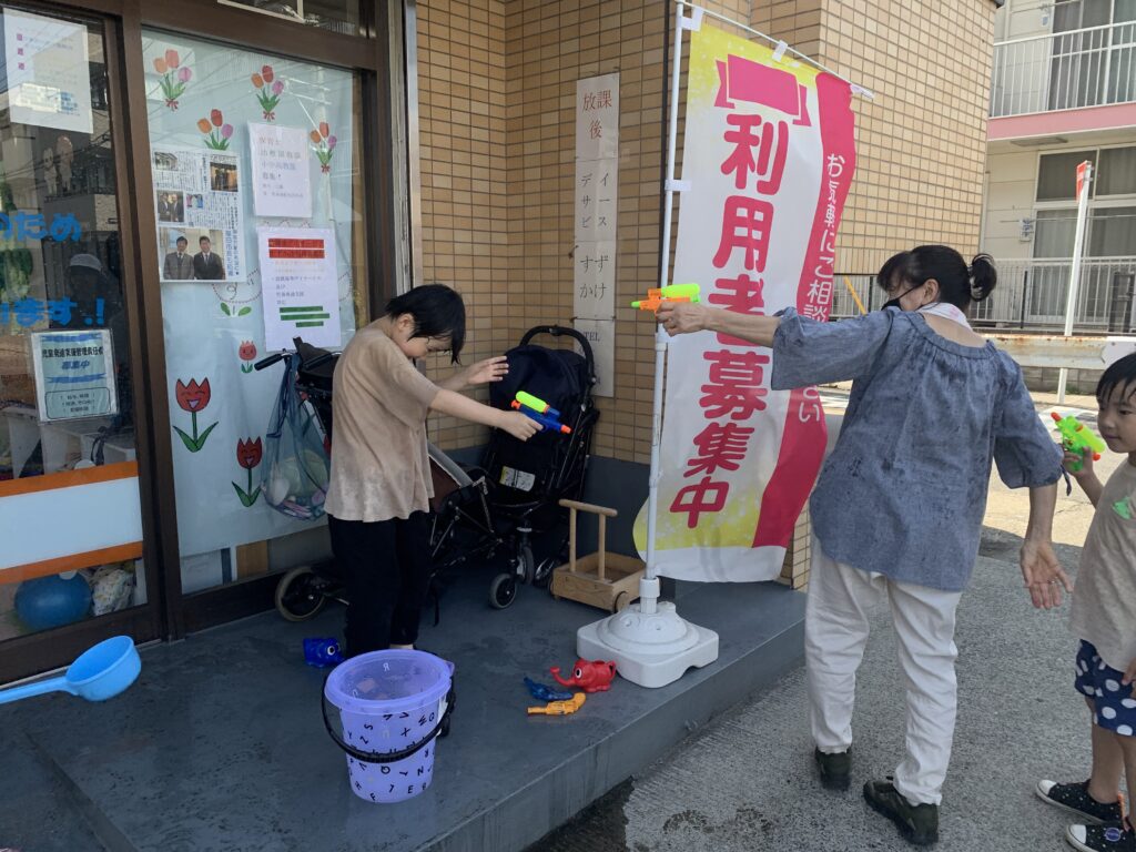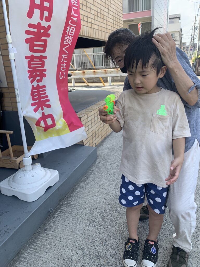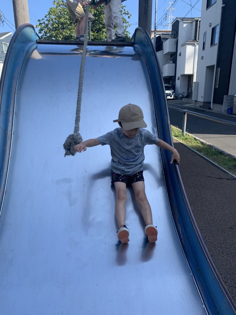 午後の水鉄砲 7月21日 容赦ない攻撃が始まりました。 的は登り旗になっています。 上手に打てるようなりましたね。 ダンプカーに水を溜めて遊んでいます。 勢いよく滑っています。最後も、立って着地成功 びびりです。 子母口旭田公園へ 7月21日 今日から夏休み開始。7月24日