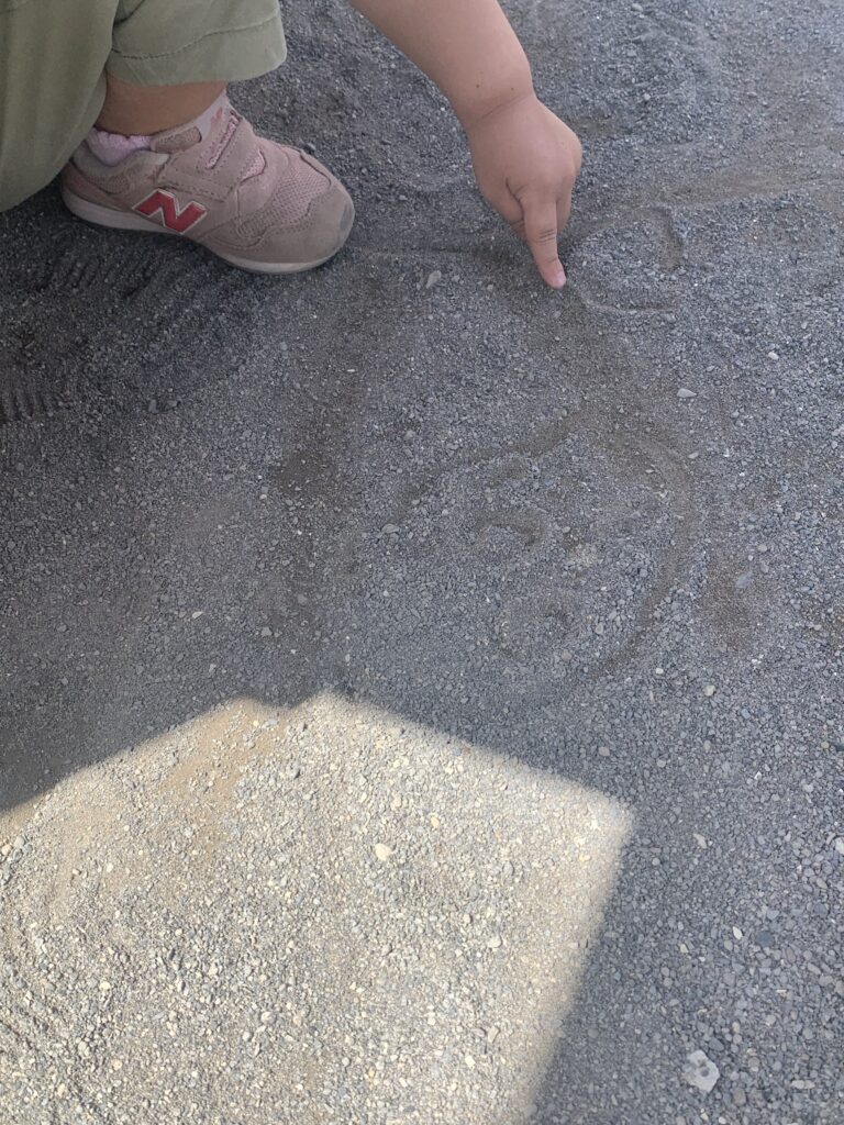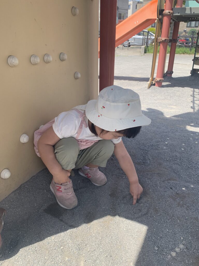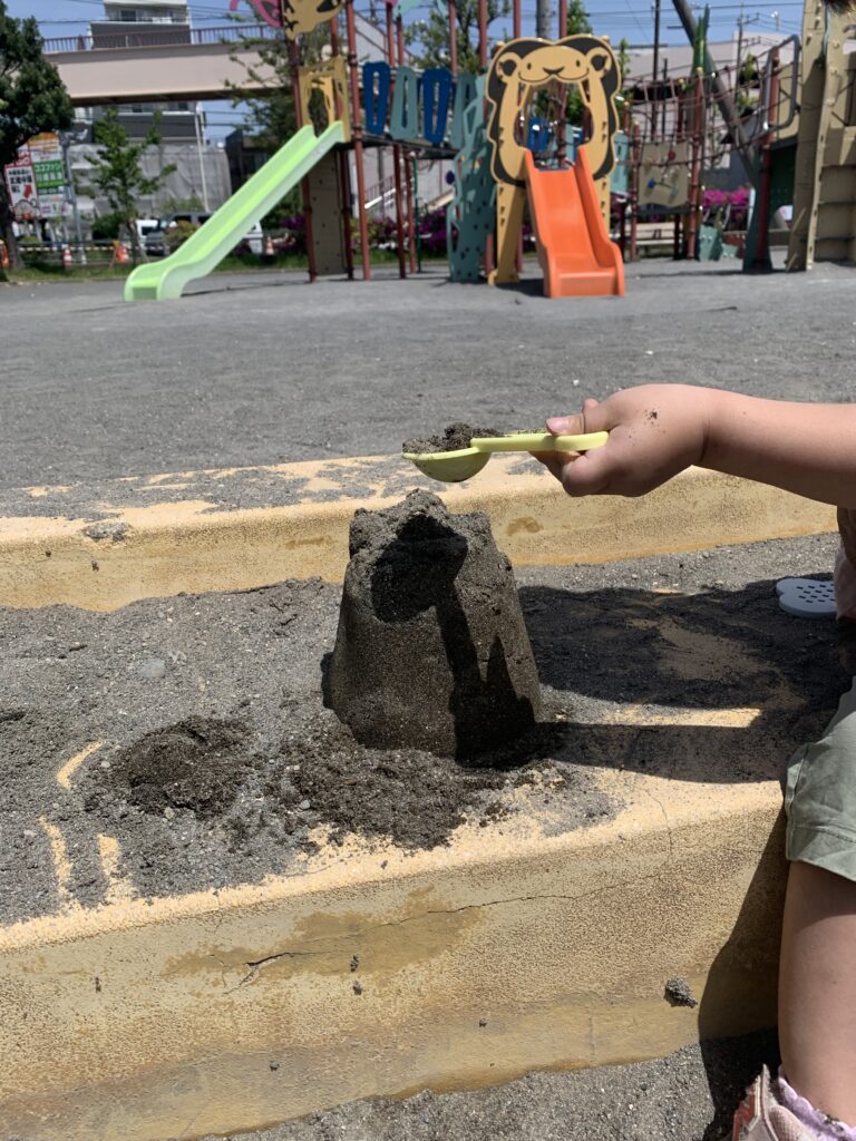 次は、砂場に移動。砂が乾いていたので水を入れて、砂を固めやすくしました。
