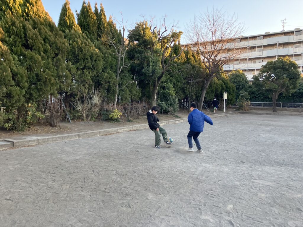 二人でサッカー。上手に蹴れるようになりましたね。