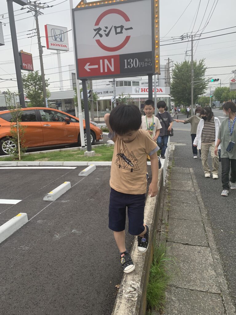 公園に行く途中、ブロックの上を渡りながら行きました。