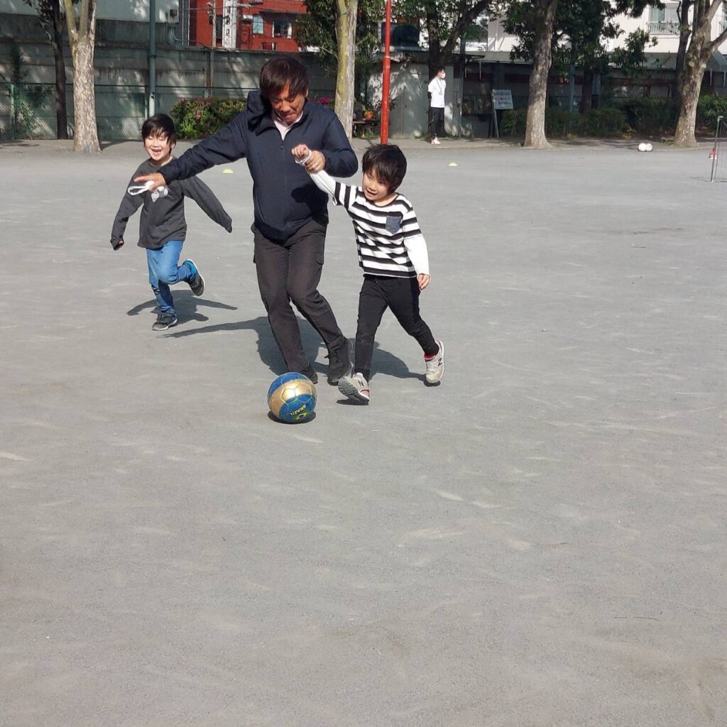 サッカーボールを蹴って、走り続けました。午前中で、水筒の中身がなくなりました。