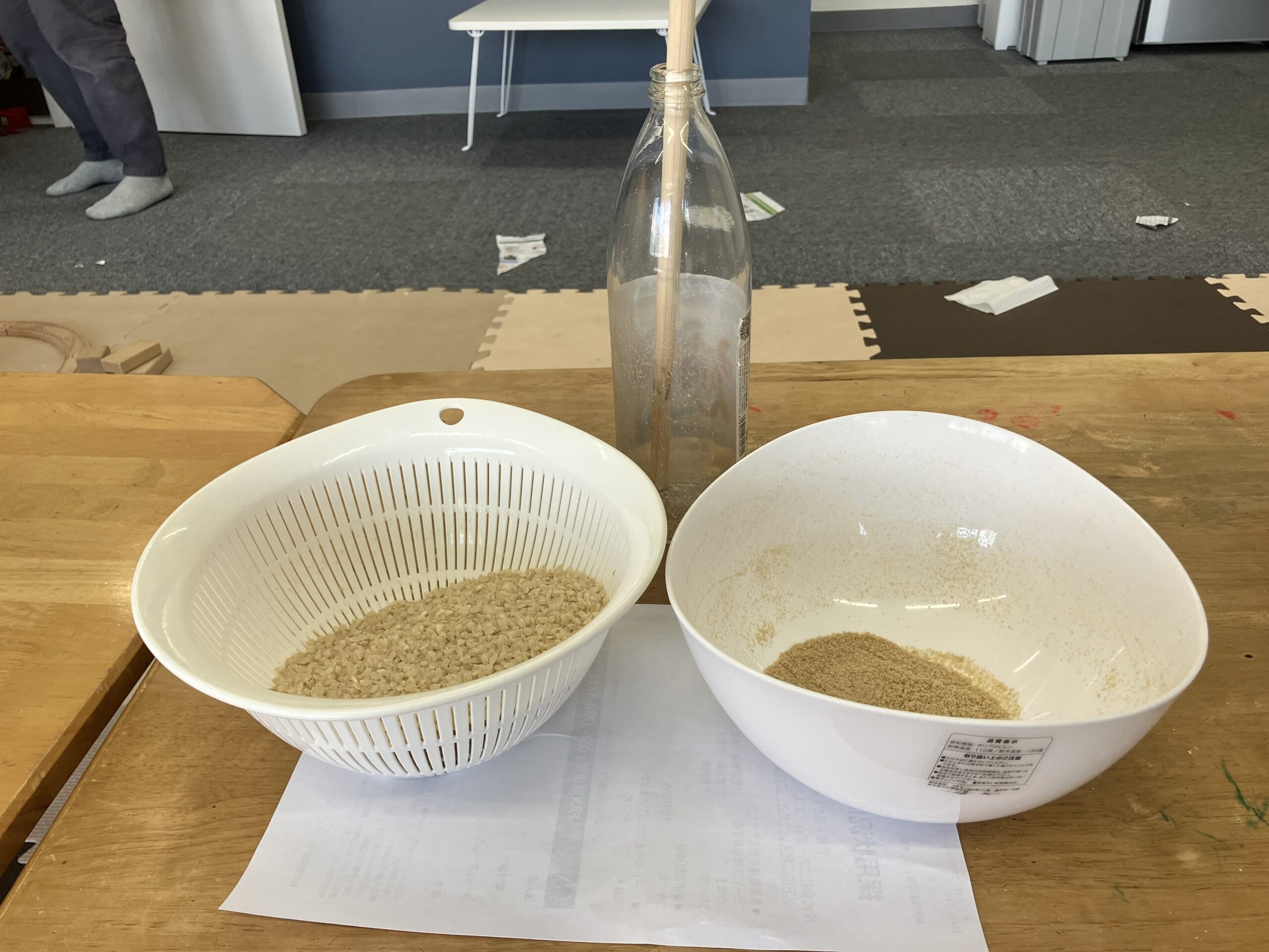 作業中。玄米を瓶に入れ直しています。