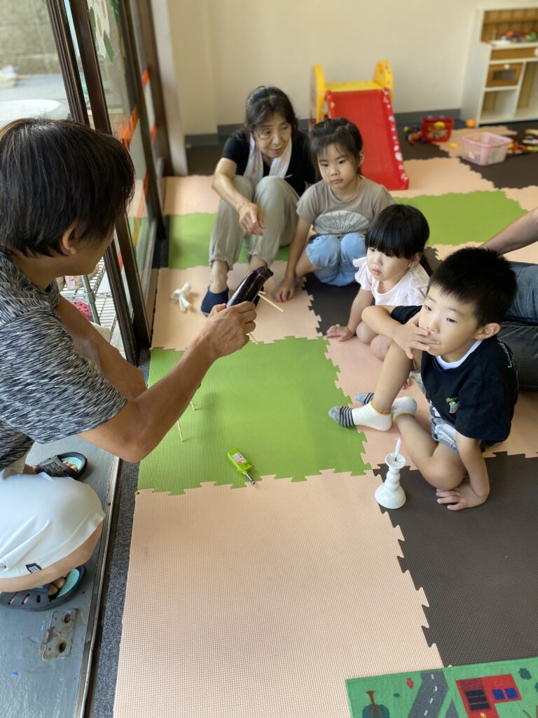 迎え火をしました。8月10日 迎え火と送り火の話しをしているところです。 馬と牛です。 みんなで手を合わせて、お迎えしました。今は、もちろん理解することは出来ませんがいつか、思い出してもらいたい思います。 水風船爆弾で遊びました。8月10日(午後) ペットショップへ(フォレスト鷺沼店)8月14日(午前...