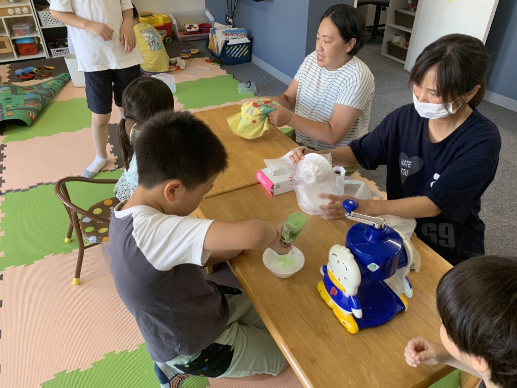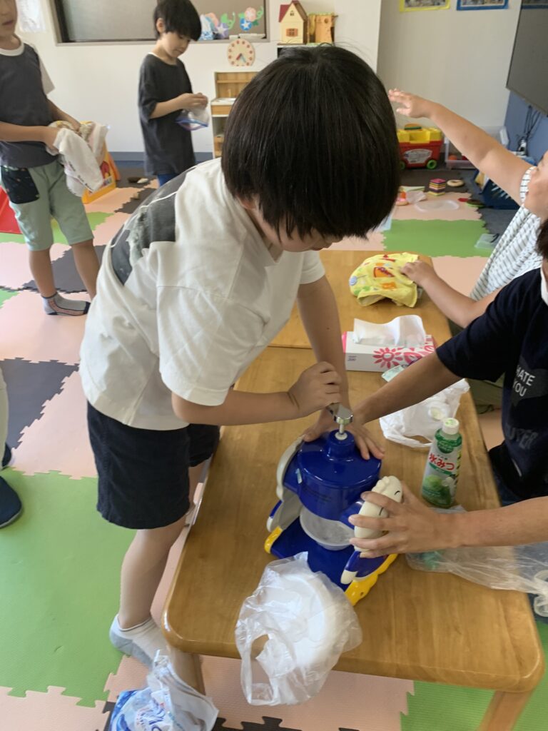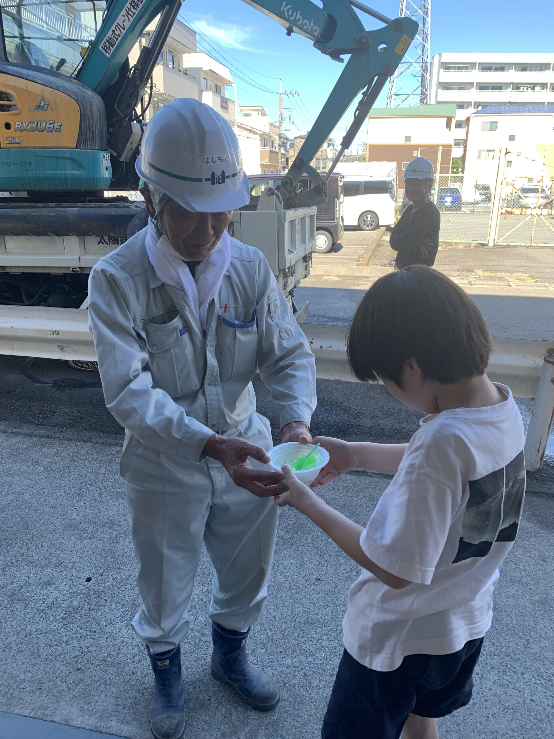 道路工事の方にかき氷をプレゼント 8月25日(午後) 暑い中、外で作業している方にかき氷を食べてもらいました。 かき氷で身体を冷やしてください。 水遊びにはいい天気だ。8月25日(午前) シャーベット作り 8月25日(午後)