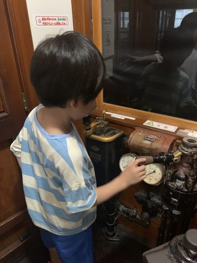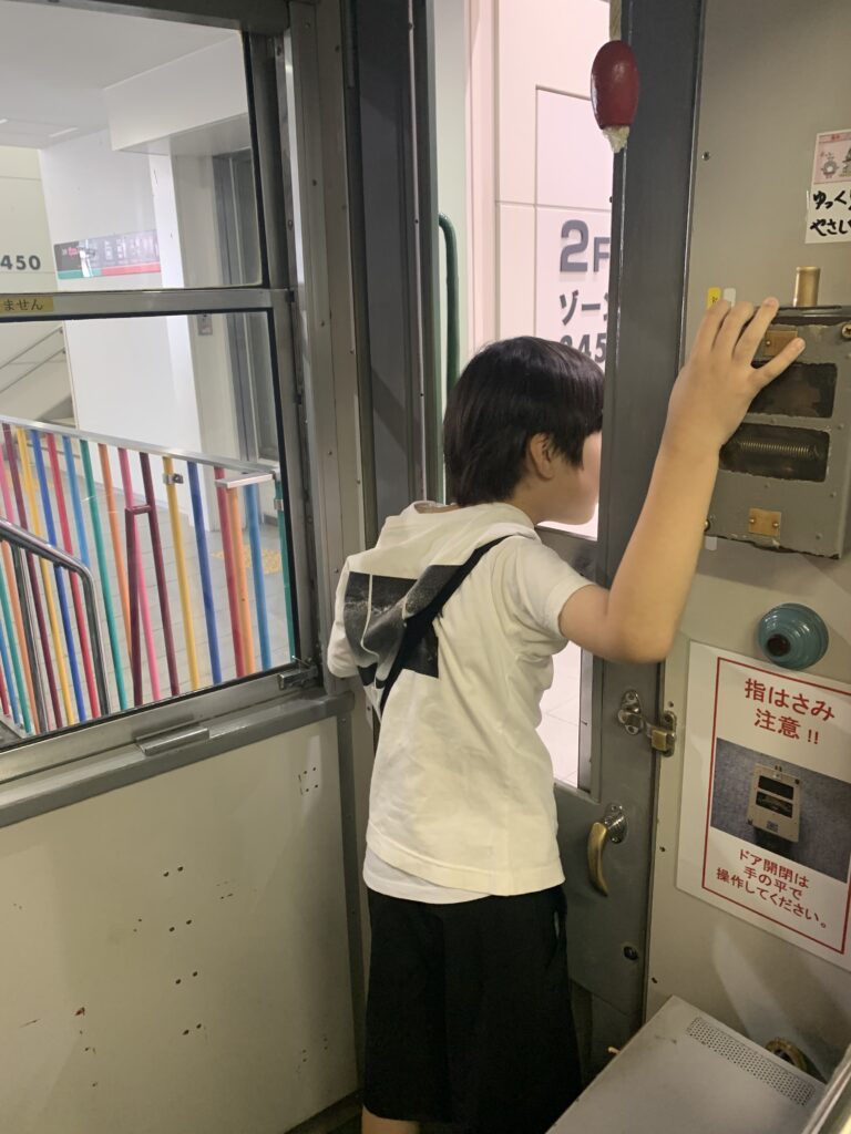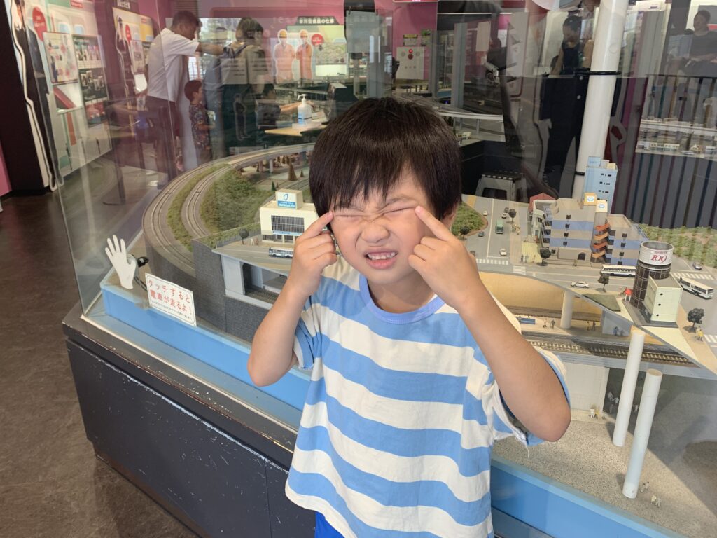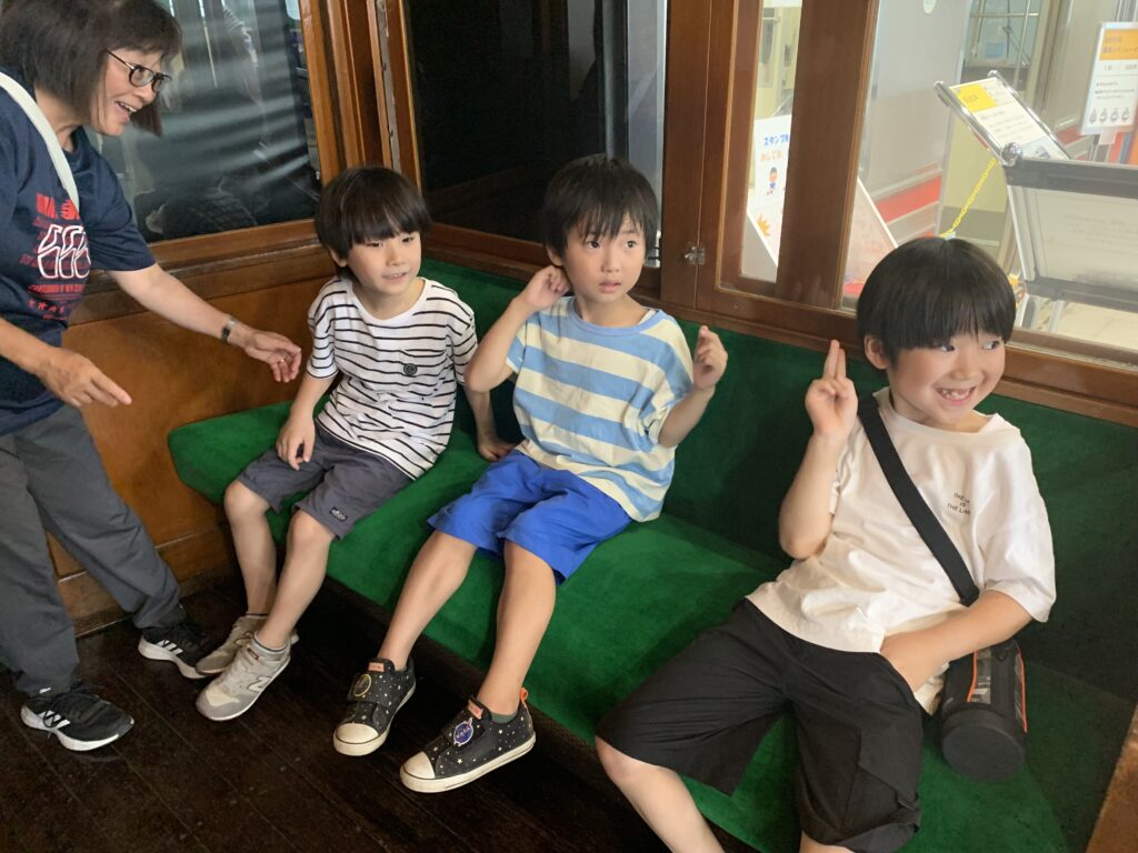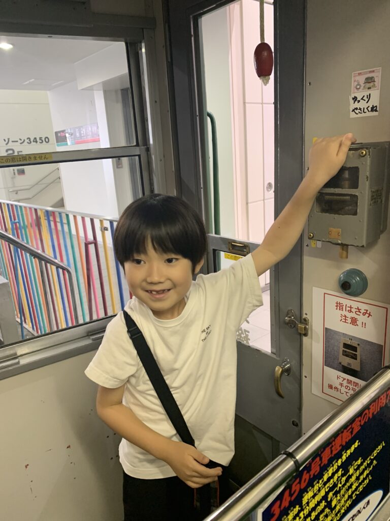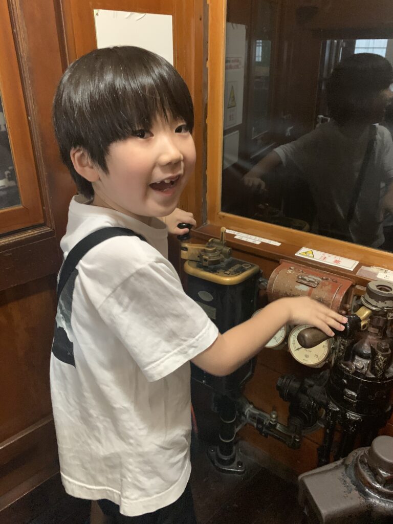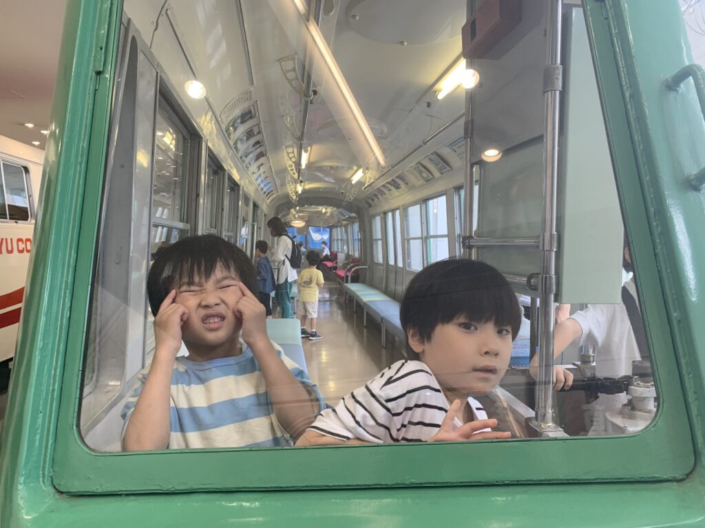 電車とバスの博物館に行きました。(宮前区宮崎台)8月1日 なんのポーズですか。 安全運転でお願いします。 かぶりついてゲージを見ています。 また、このポーズ お客さんがちゃんと乗ったか、確認してよ。 車椅子の練習をしました。7月31日 水遊び 8月2日(午前)