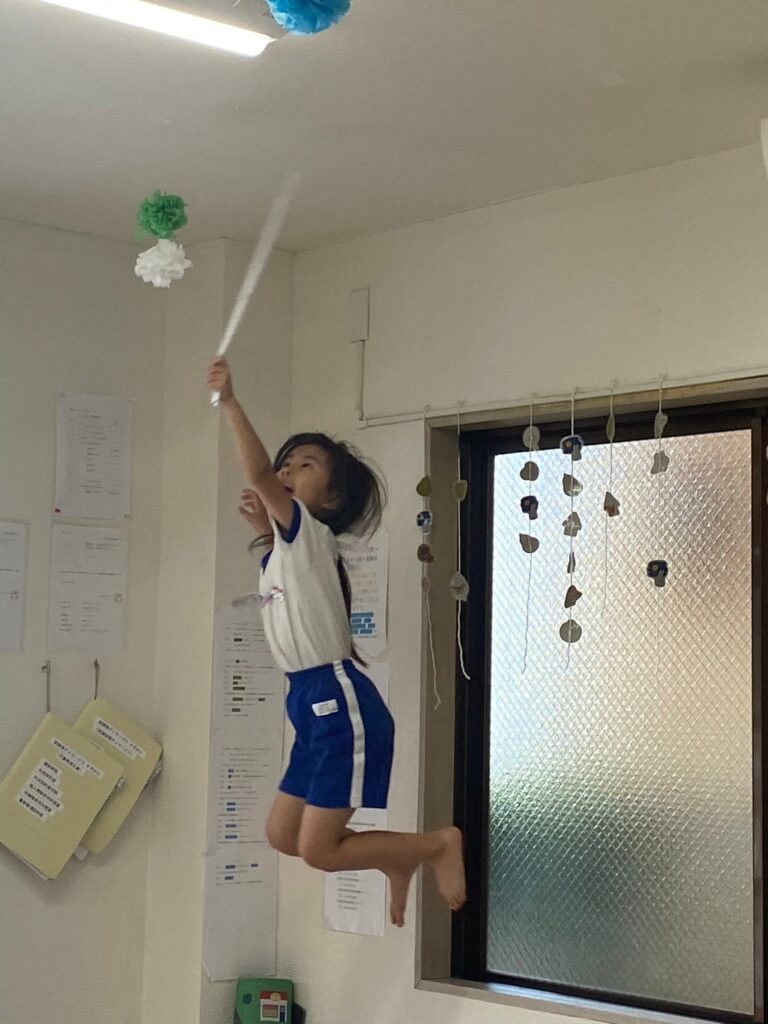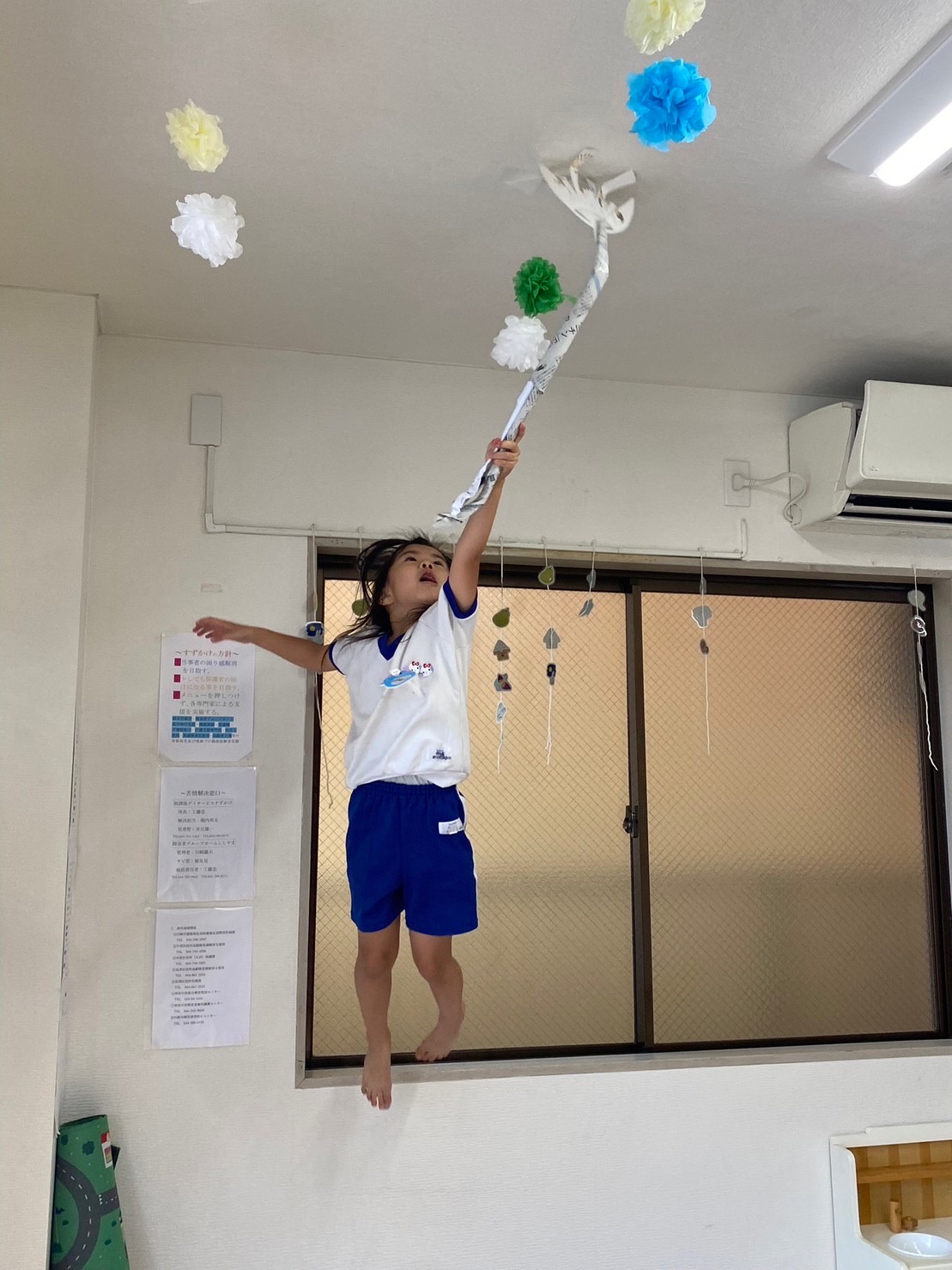 窓枠から飾りを取りに挑戦。