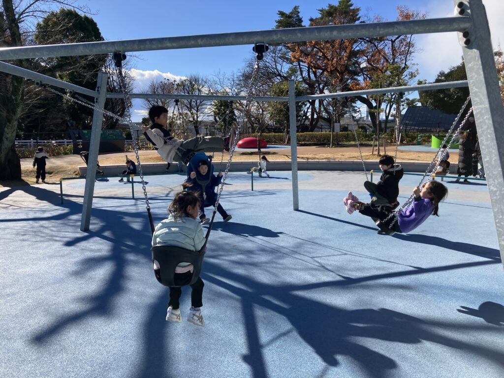 馬事公苑(世田谷区上用賀)へ 12月26日 馬事公苑は、東京オリンピックの乗馬会場になりました。そのため、遊具も新しくなりました。 色々な種類のブランコがありました。 12月25日の様子 洗足池(大田区南千束)へ 12月29日