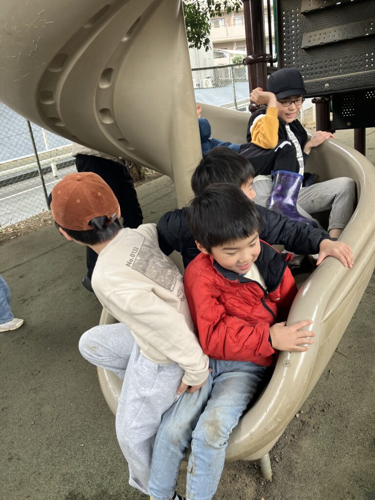 くすぐり攻撃から逃げるため、滑り台が大混雑中