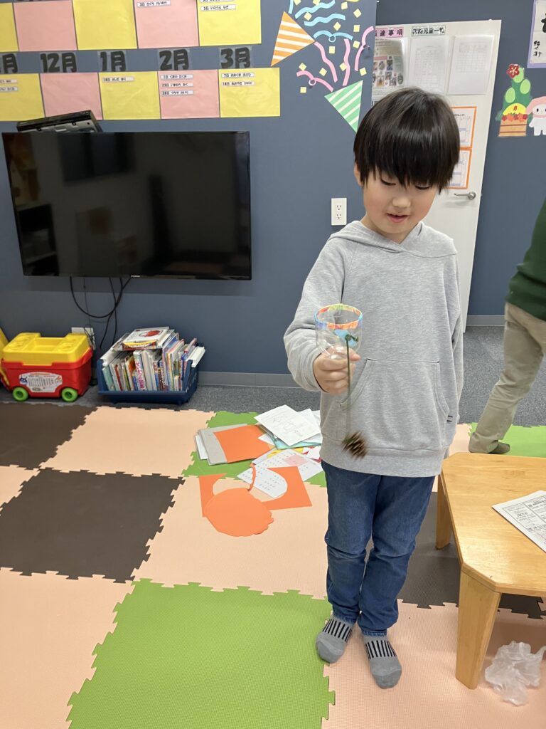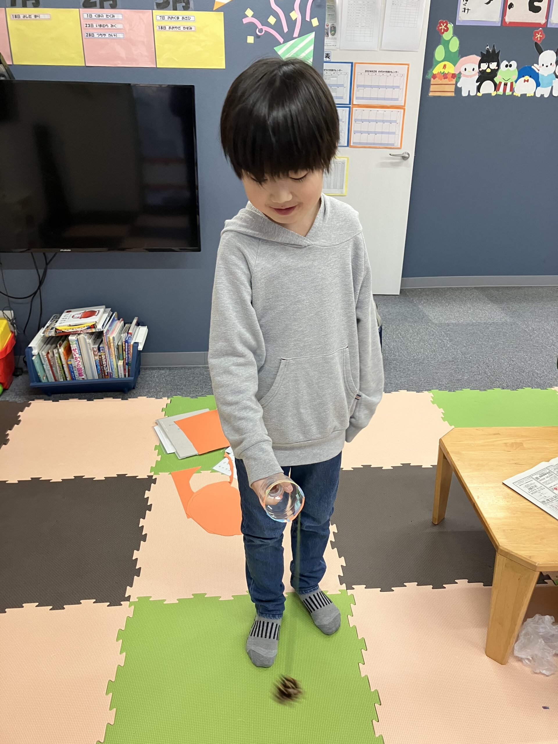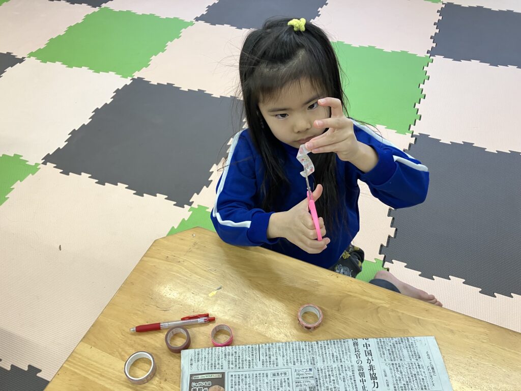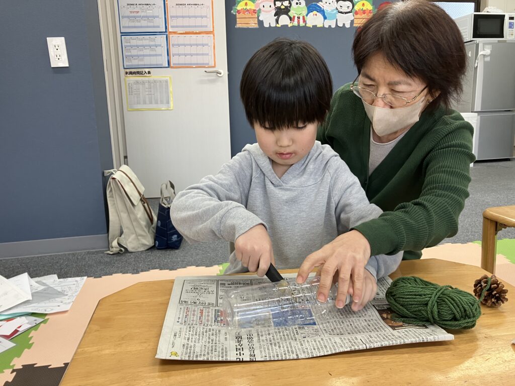 1月18の様子 松ぼっくりけん玉作り。カッターでペットボトルを切っています。 上手く受け皿に入れられるかなぁ。 小さくシールを上手に切っています。 駒と松ぼっくりけん玉作り 1月17日(午後) 1月19日の様子