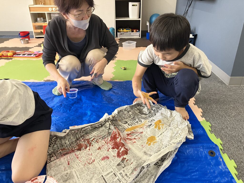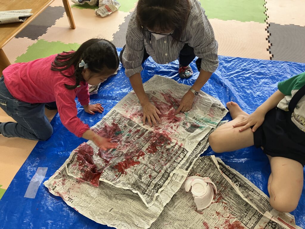 水彩絵の具で木の模様をペタペタ。手は絵具だらけ、どこかになすりつける前に手を洗いましょう。