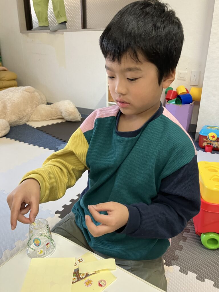 クリスマスベル作り、シールを貼りました。
