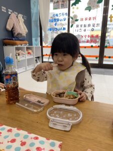 遊んだあとのご飯は、おいしいね。お母さん、お弁当作ってくれてありがとう。