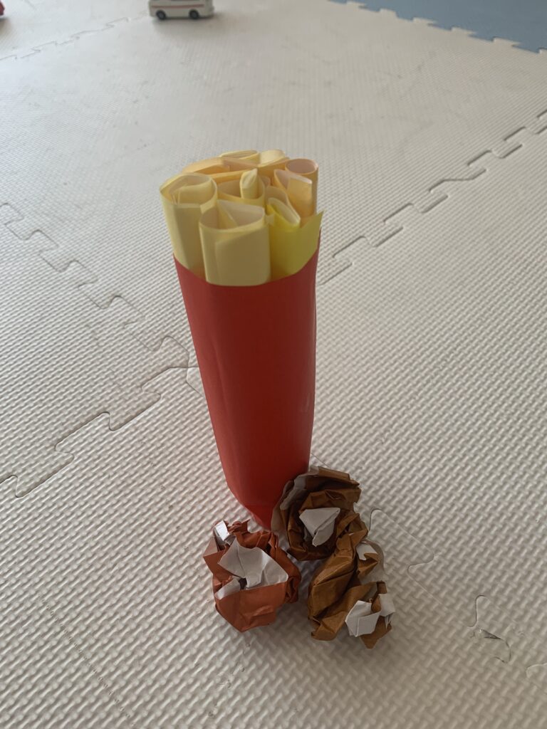 題名は、『ポテトと唐揚げ』男の子制作。顔写真は、恥ずかしいのNGです。