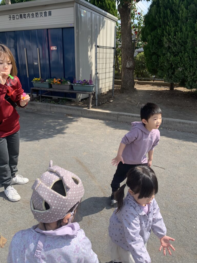 シャボン玉を追いかけることになりました。風があるからどこに飛んでいくかわからないからね。