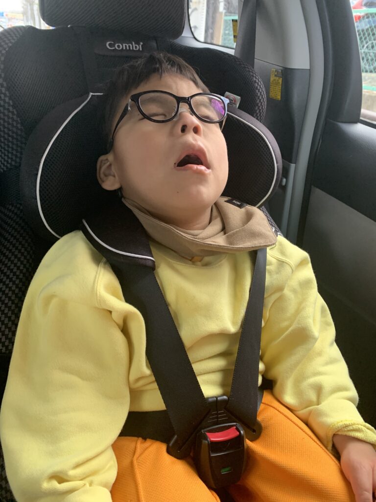 幼稚園に迎えに行った車内の様子です。久しぶりの幼稚園登園で疲れたようですね。