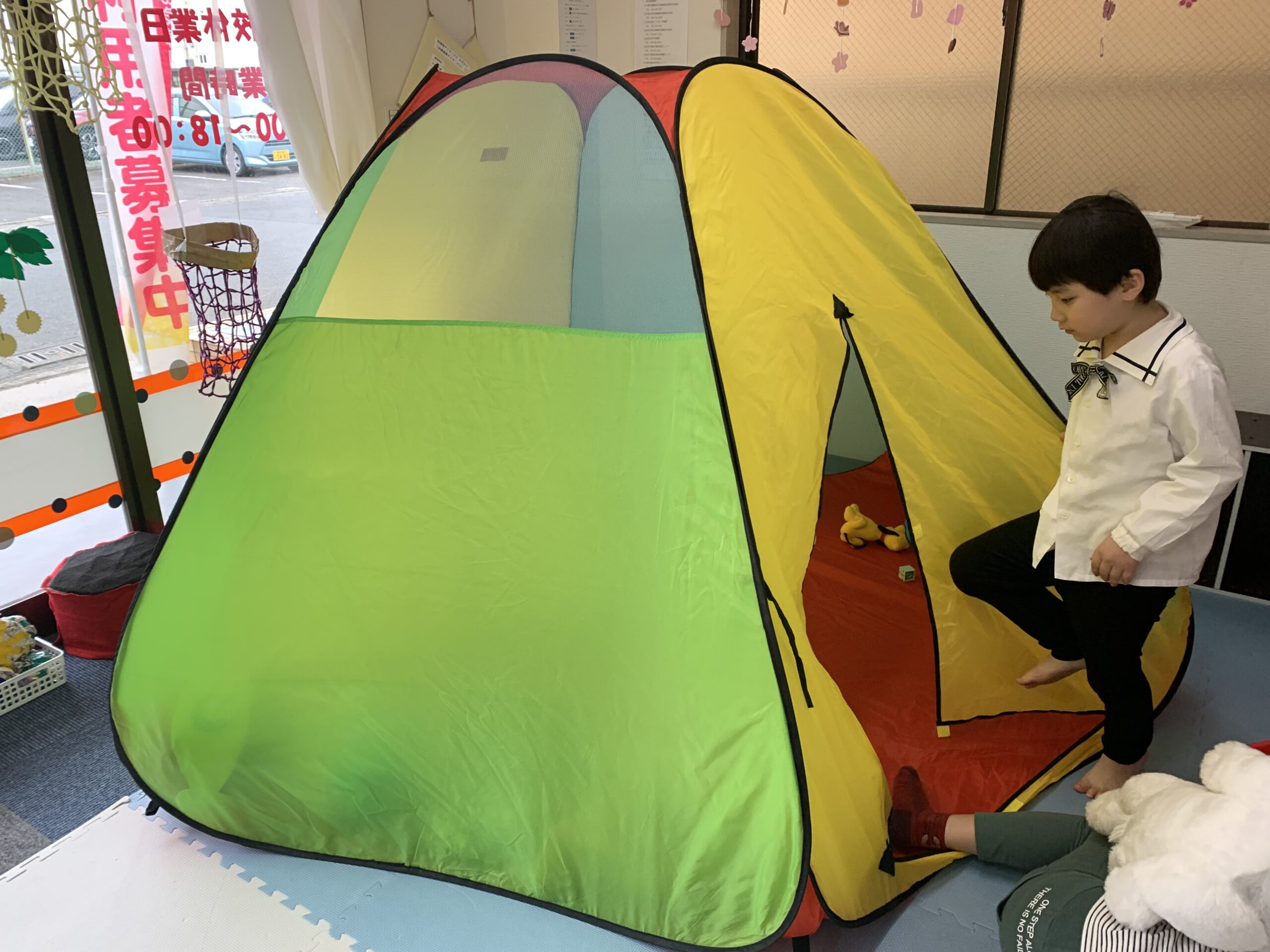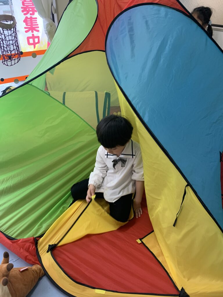 テントに向かって走って、遊んでいます。