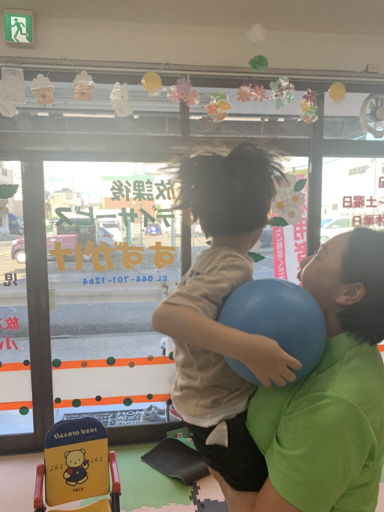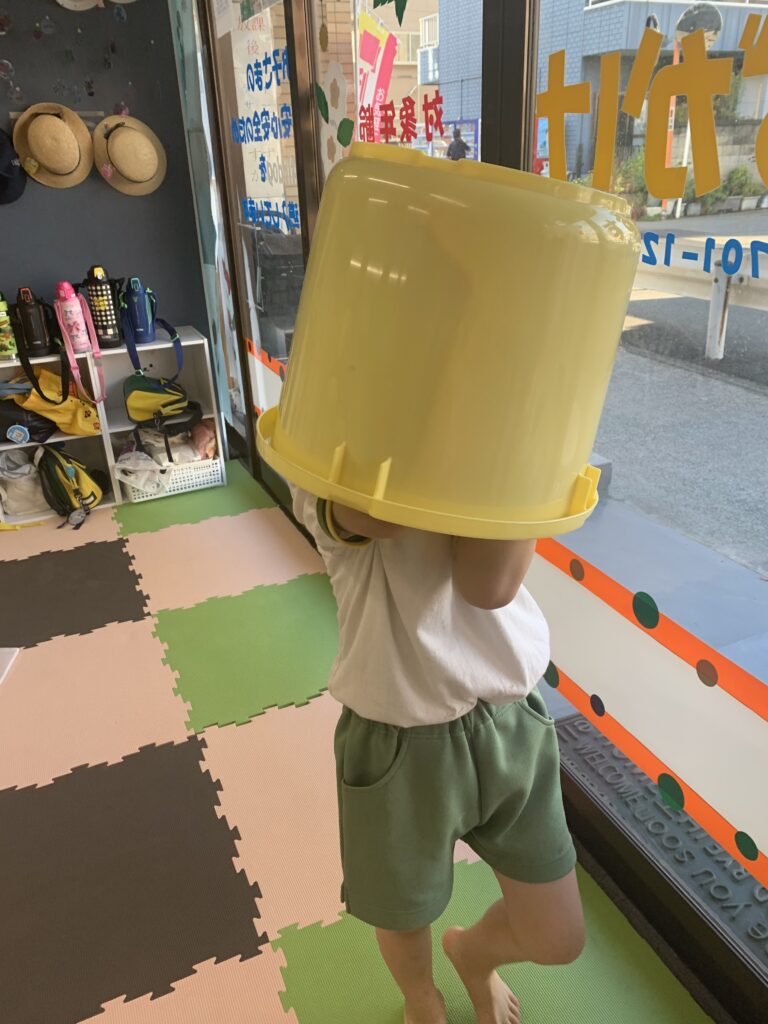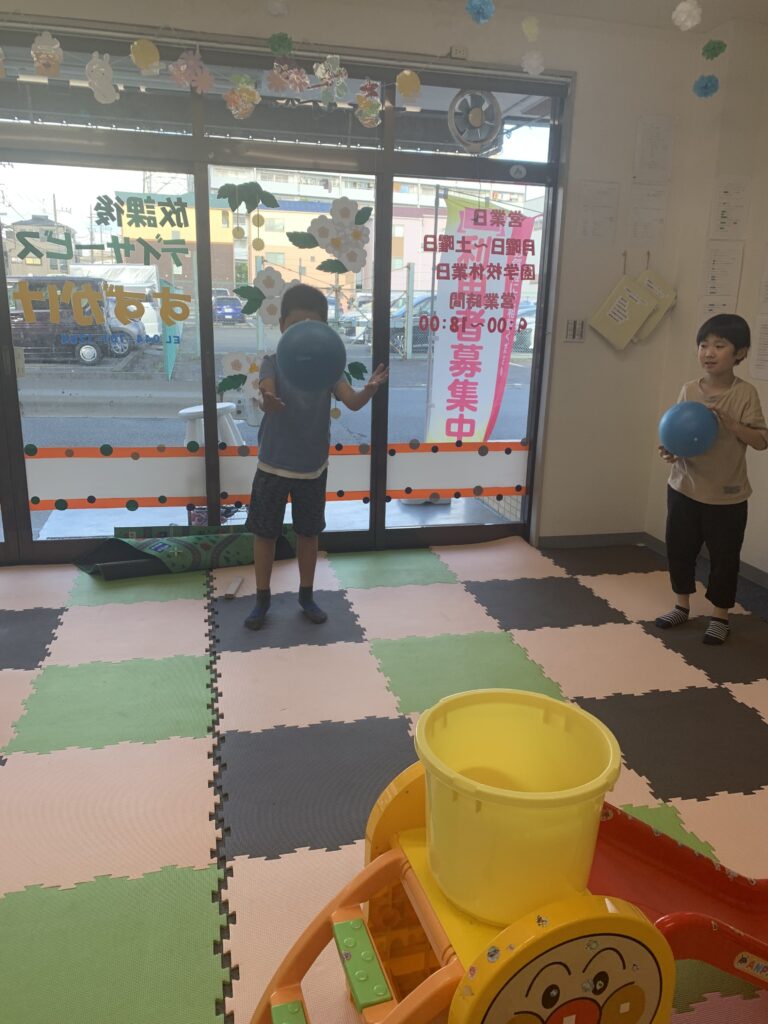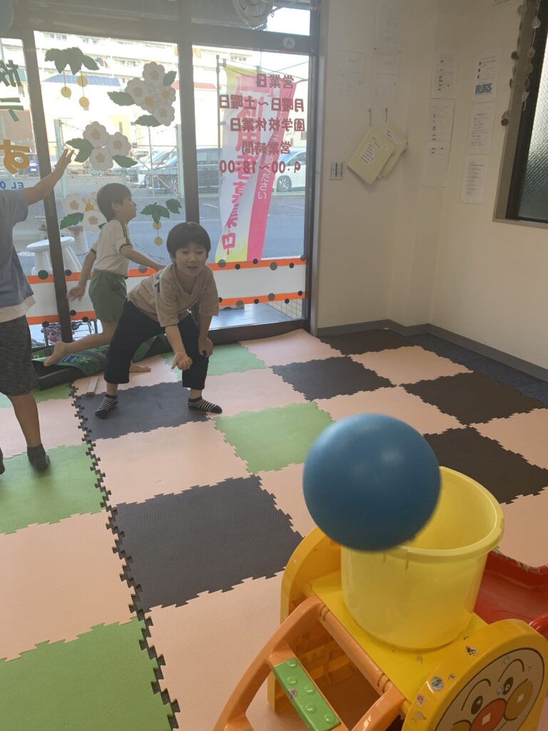 たらいの中にボールを入れることに挑戦しました。二人とも、頑張ってたらいの中に入れることが出来ました。よく、頑張りました。