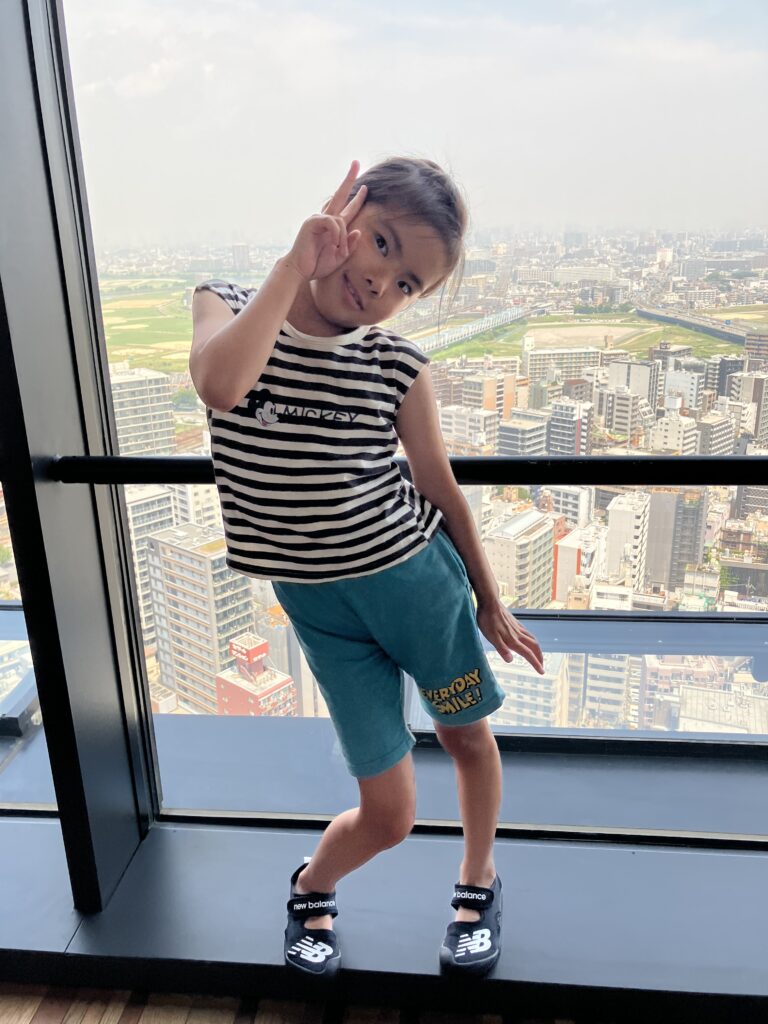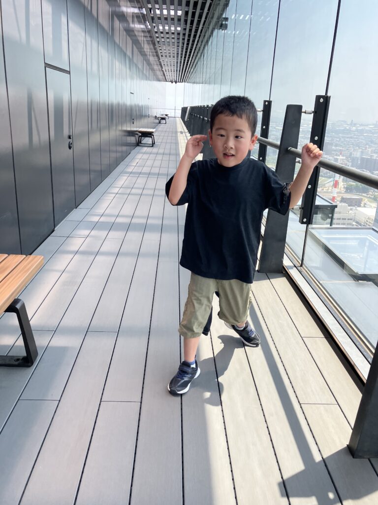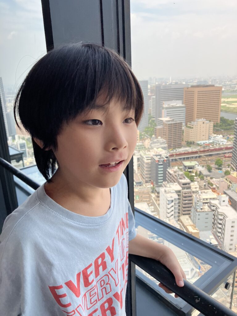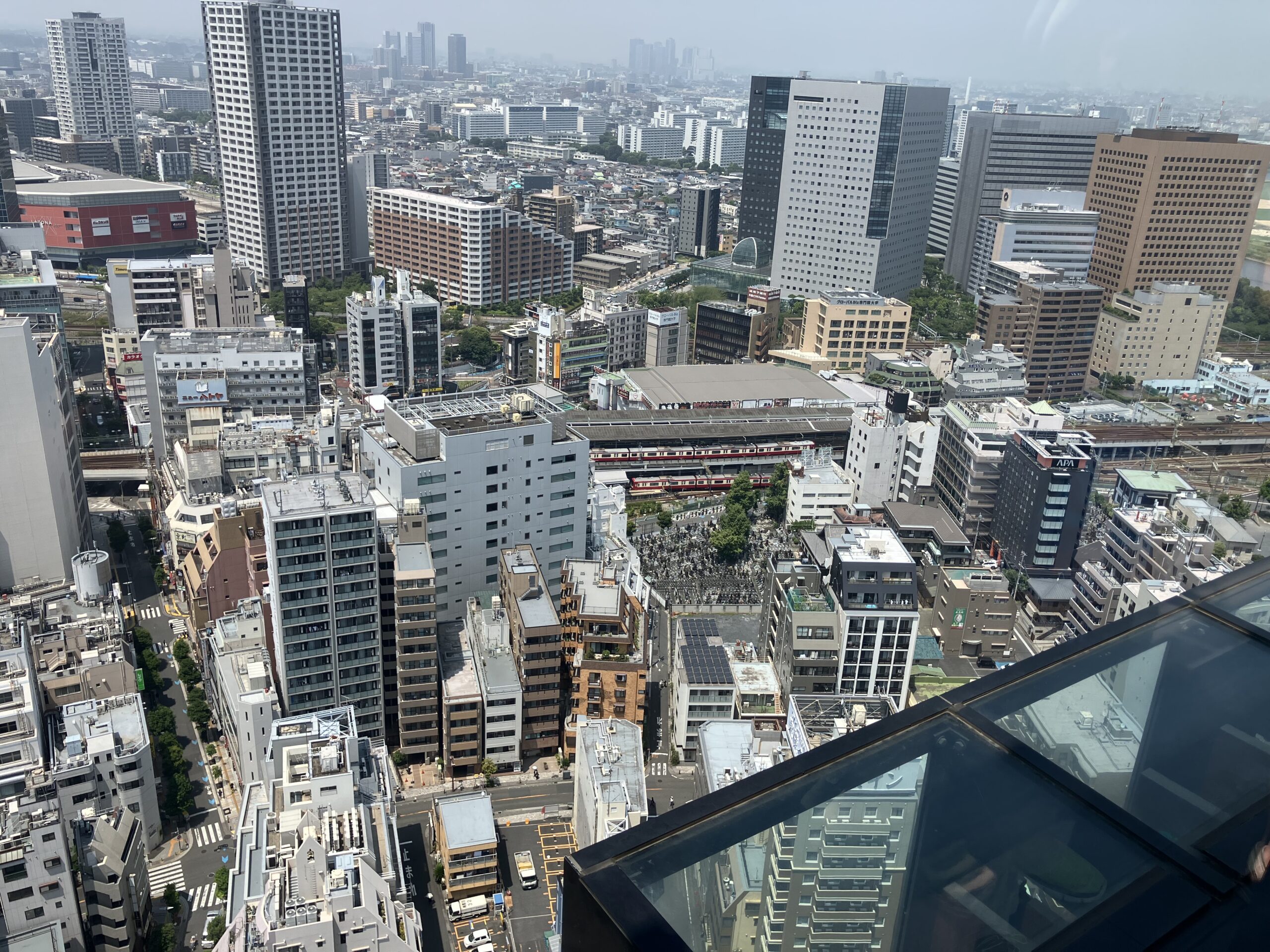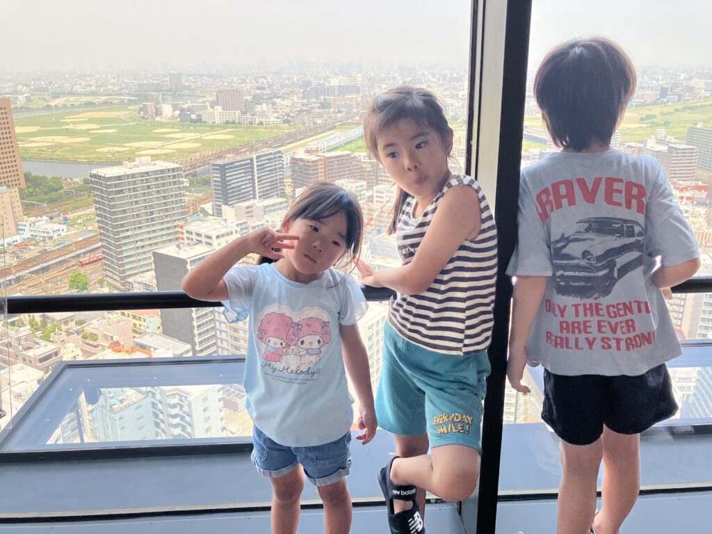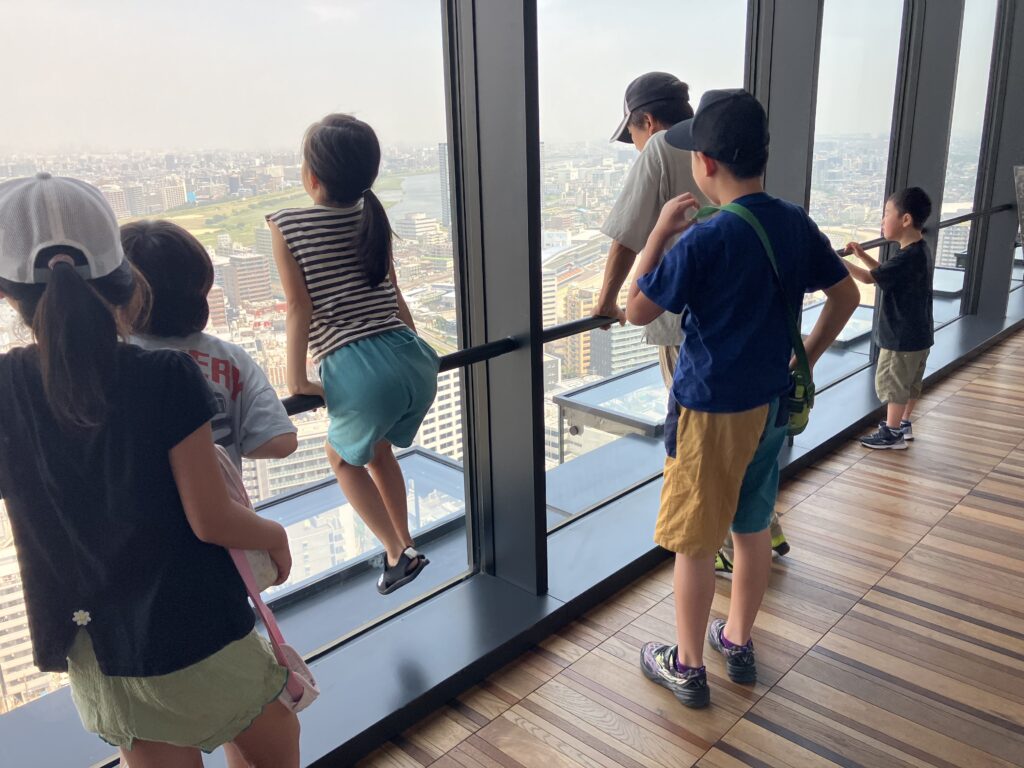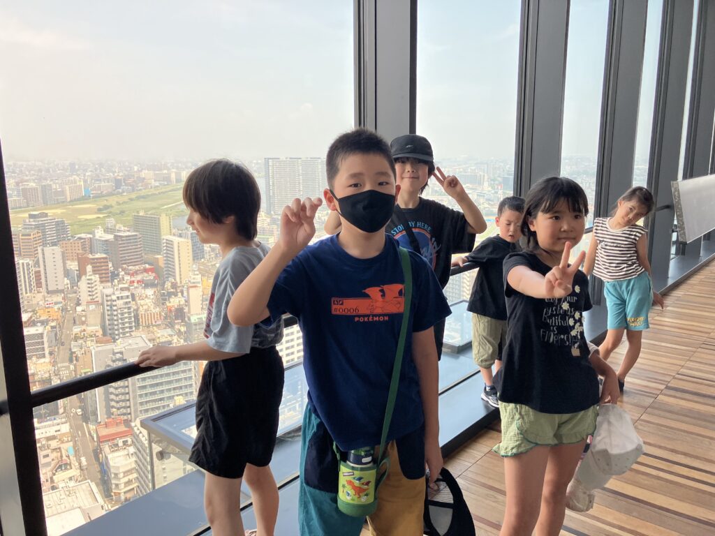 25階からの景色を見ました。8月6日(午前) 川崎市役所25階展望階に行きました。 京浜急行とラゾーナ川崎が見えました。 自由に歩きまわりました。 景色は、どうでしたか。富士山は、見えなかったね。 8月5日の様子 はじき絵制作 8月6日(午後)