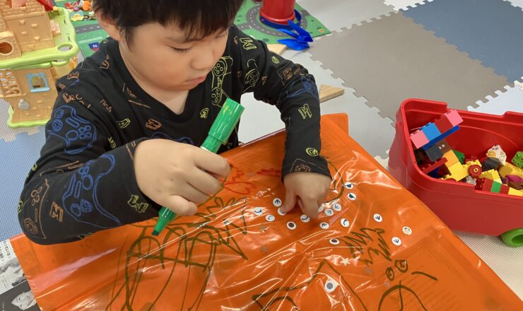 どんなマントになるのか、楽しみですね。 シールを顔につけています。 絵を描くのが大好きだね。