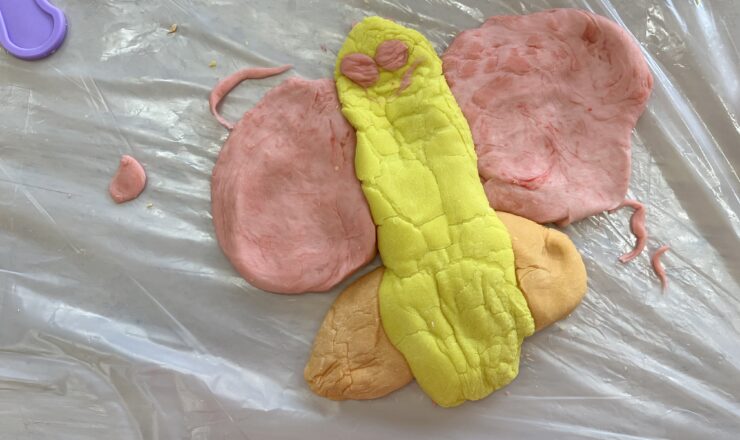 急に始まった、椅子取りゲーム。音楽がとまる前に椅子に座ろうとしていました。 粘土遊び。何を作るのかなぁ。 粘土を顔に付けて、遊...