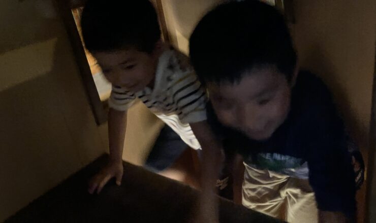 落ちるなよ。 仰け反った時に後ろの壁に頭をぶっけて、泣いているところです。 午後からは、染物をしました。 どんな模様になります...