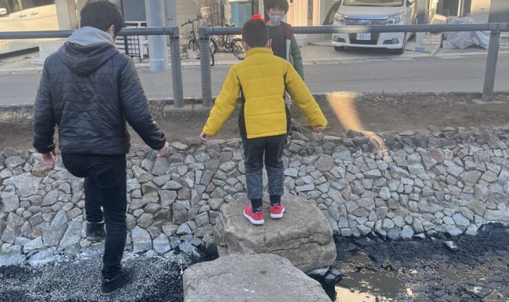 勢いがついてしまい滑っています。 仲良く渡っています。 散歩に来ていた犬と触れあいました。可愛い犬だったね。また、会えるかなぁ...