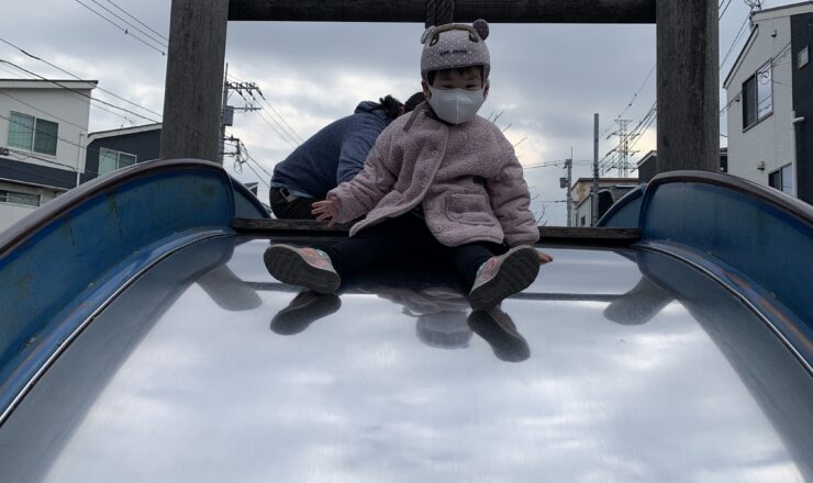 せせらぎ沿いにある滑り台です。夏によく遊びに来ましたね。 少し、顔が強張っていますね。 ブランコの揺れが一番、楽しいようです。...
