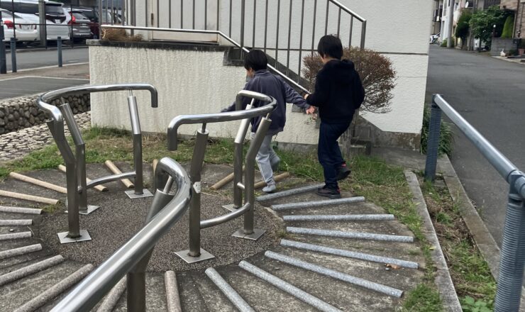 せせらぎ遊歩道にある足つぼを歩いてみました。痛いようで、ゆっくり歩いています。 走って、早く行きたいようです。靴を脱いでいませ...